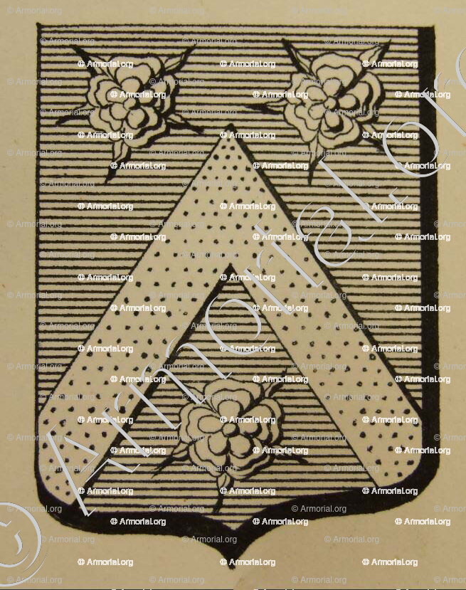 " D'azur, au chevron d'or, accompagné de trois roses d'argent, posées 2 et 1. "