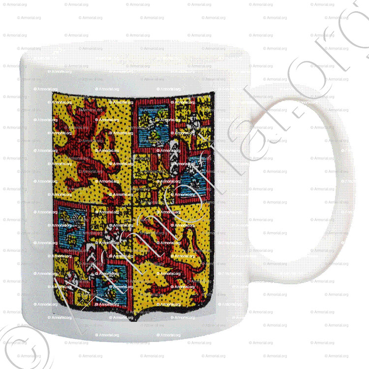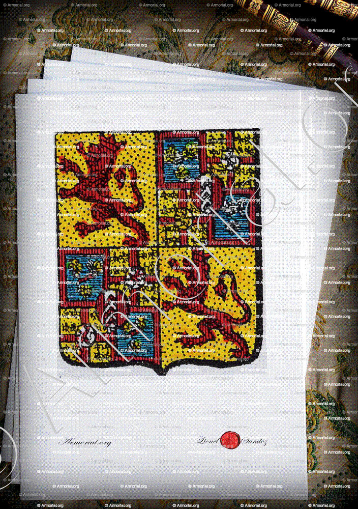 " Écartelé: aux 1 et 4, d'or, au lion de gueules, couronné de même, aux 2 et 3, contre-écartelé: aux 1 et 4, de Bourbon-Soisson, aux 2 et 3, de Montmorency-Luxembourg, sur le tout du 2 et 3, de gueules au pal d'argent, chargé de trois chevrons de sable, qui est Neufchatel."