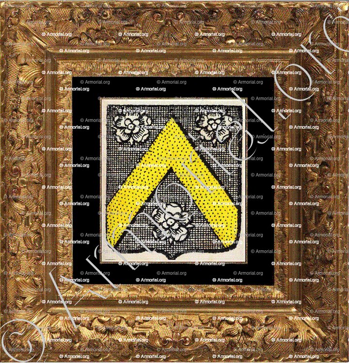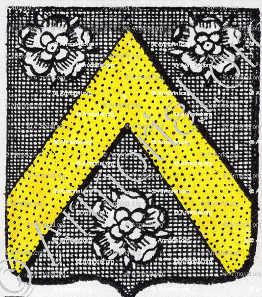 " De sable, au chevron d'or, accompagné de trois roses d'argent. "