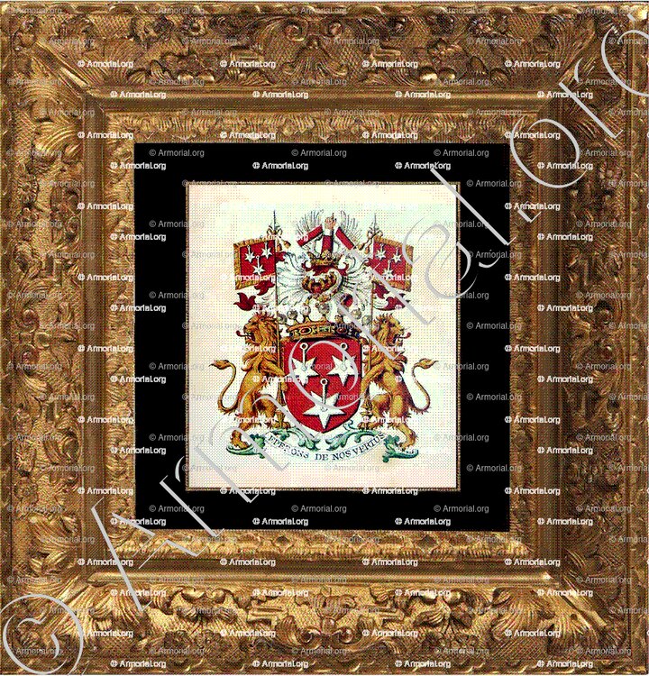 Supports: deux lions regardants d'or, armés et lampassés de gueules, tenant chacun un bannière aux armes de l'écu.