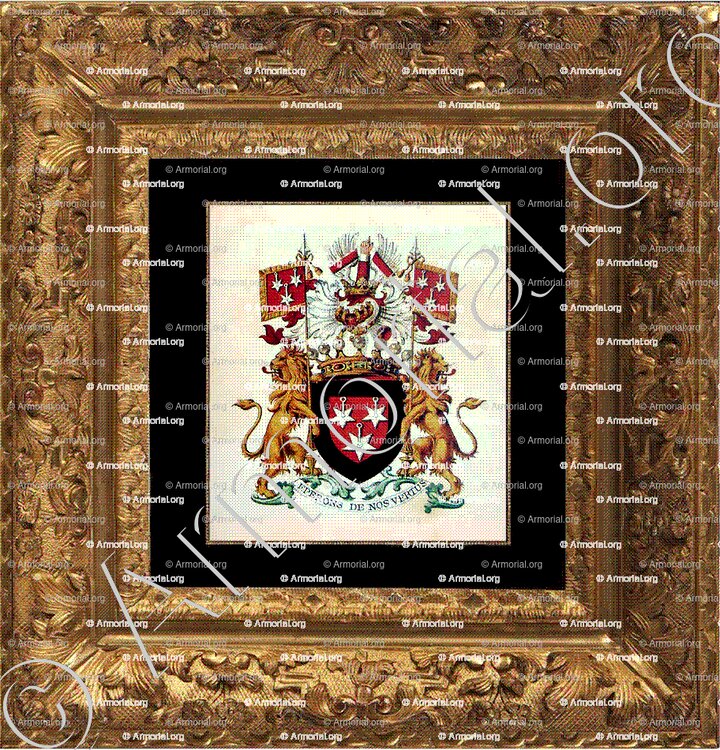 Supports: deux lions regardants d'or, armés et lampassés de gueules, tenant chacun un bannière aux armes de l'écu.
