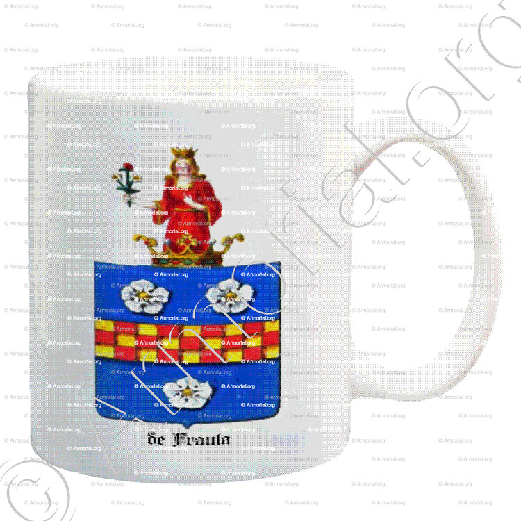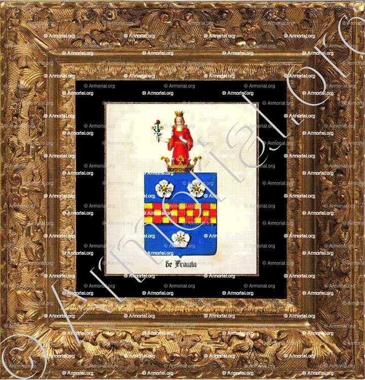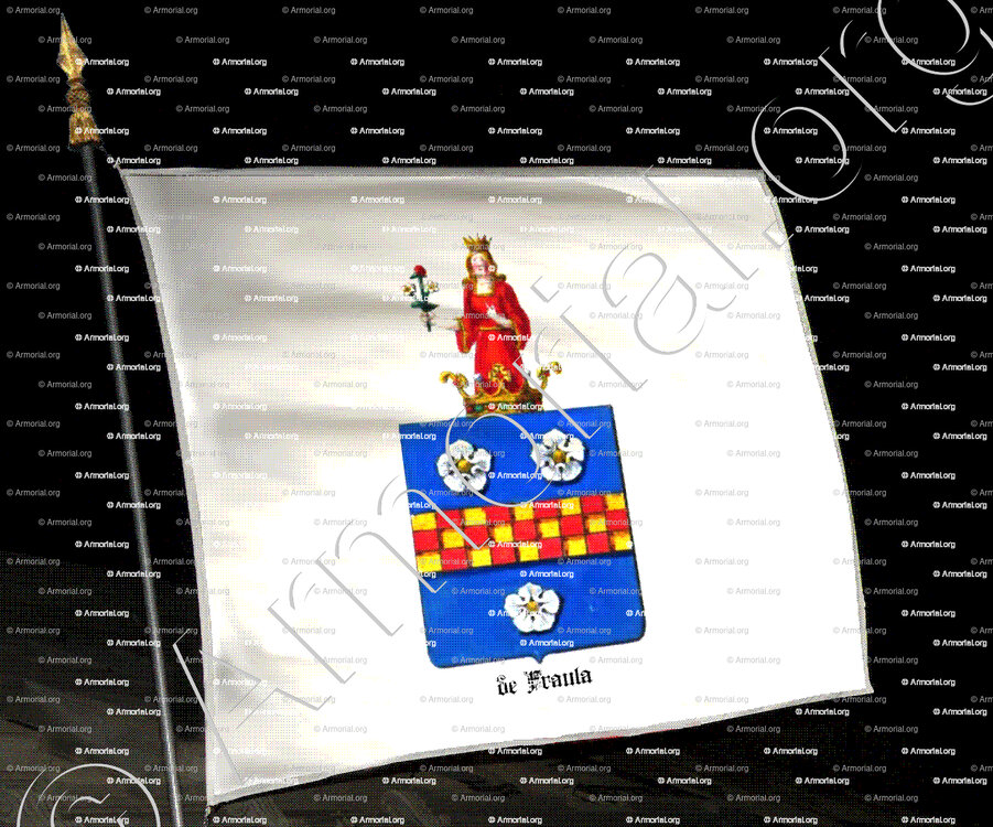 Cimier: une reine, couronnée à l'antique d'or, habillée de gueules, tenant de sa main dextre une branche de rosier au naturel, fleurie de deux pièces, la main senestre posée sur son coeur.