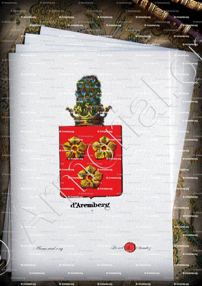 Família D'AREMBERG - Blazon D'AREMBERG - Braços D'AREMBERG - Crista da família D'AREMBERG - Armorial D'AREMBERG - Armas D'AREMBERG - Braços em um protetor D'AREMBERG - Brasonadas D'AREMBERG - Estampada D'AREMBERG - Escudo blazoned D'AREMBERG - Arquivo D'AREMBERG - Ascendência D'AREMBERG - Progeny D'AREMBERG - Heráldica D'AREMBERG - Origem D'AREMBERG. - O D'AREMBERG na História - D'AREMBERG na nobreza - Moeda D'AREMBERG - Burguesia Braços D'AREMBERG - Nobreza Braços D'AREMBERG.