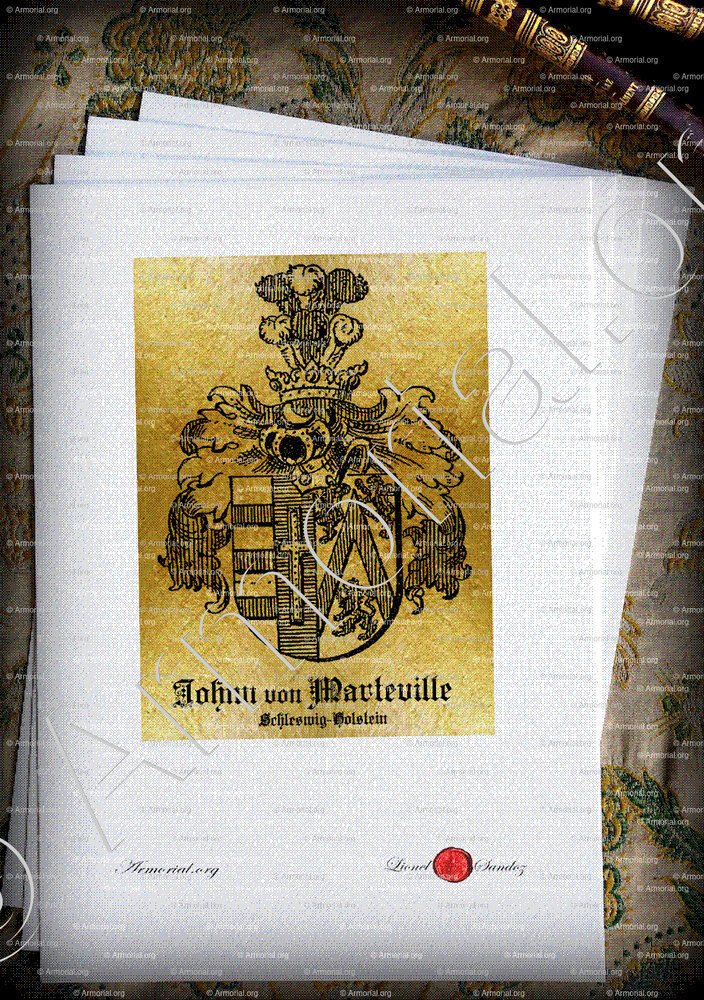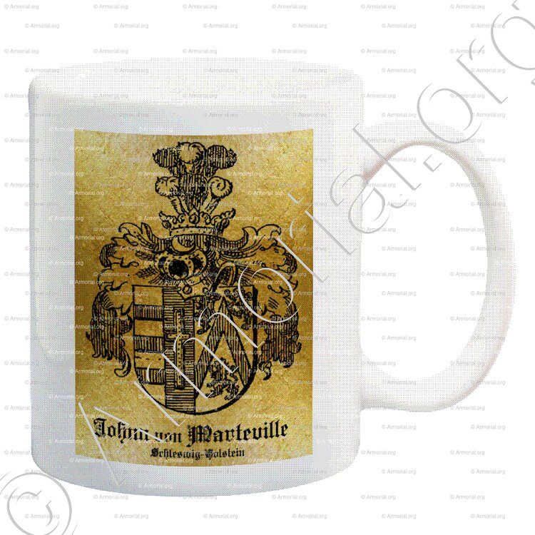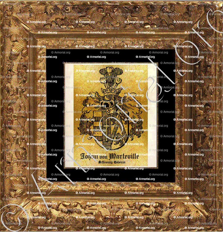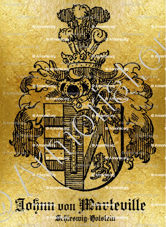 " Parti: au 1, les armes de von Johnn qui sont reparties: a. d'argent à trois fasces de gueules; b. d'azur à une croix latine d'or, bordée de gueules; au 2, les armes de Marteville qui sont d'argent au chevron de gueules, accompagné de trois lions du même."