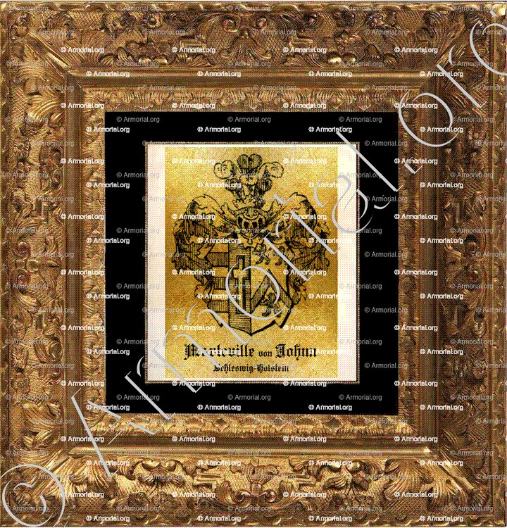 " Parti: au 1, les armes de von Johnn qui sont reparties: a. d'argent à trois fasces de gueules; b. d'azur à une croix latine d'or, bordée de gueules; au 2, les armes de Marteville qui sont d'argent au chevron de gueules, accompagné de trois lions du même."
