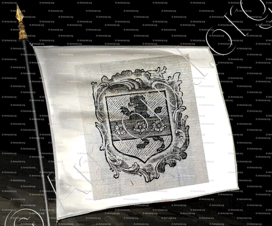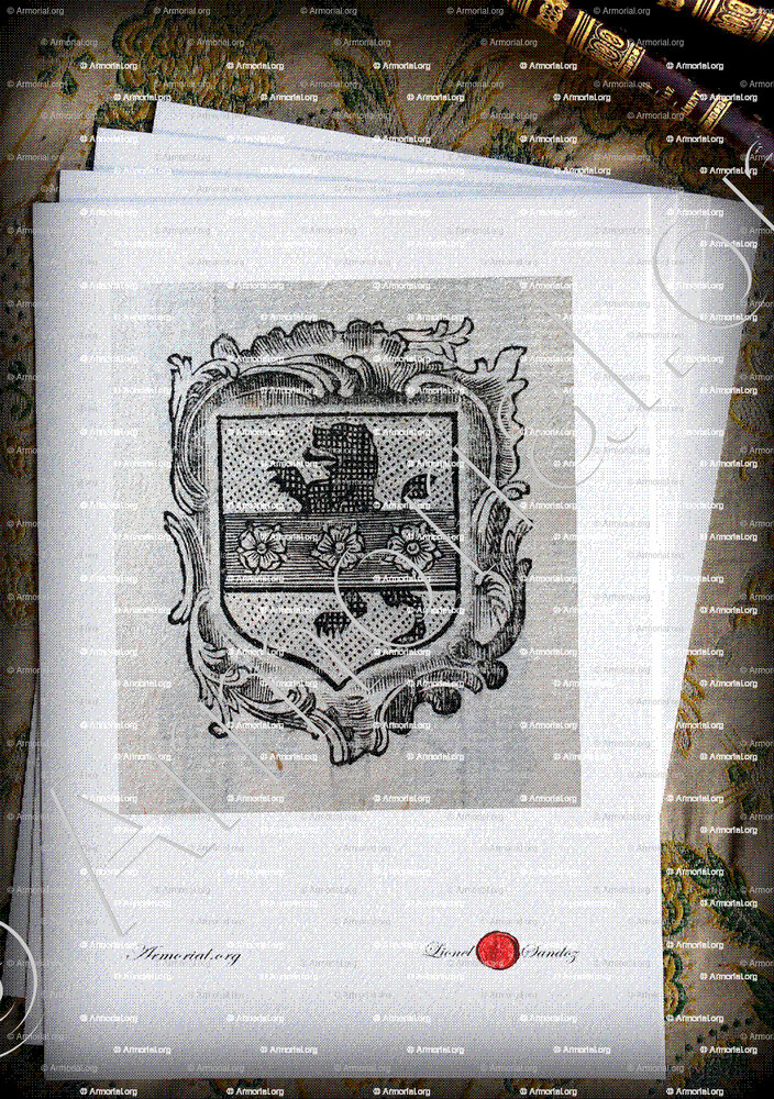 Cimier: un lion de sable tenant en ses pattes une branche de rosier au naturel, portant les roses d'argent de l'écu, celui naissant et porté d'un armet morné, couvert de son lambrequin aux métaux et couleurs de l'écu.