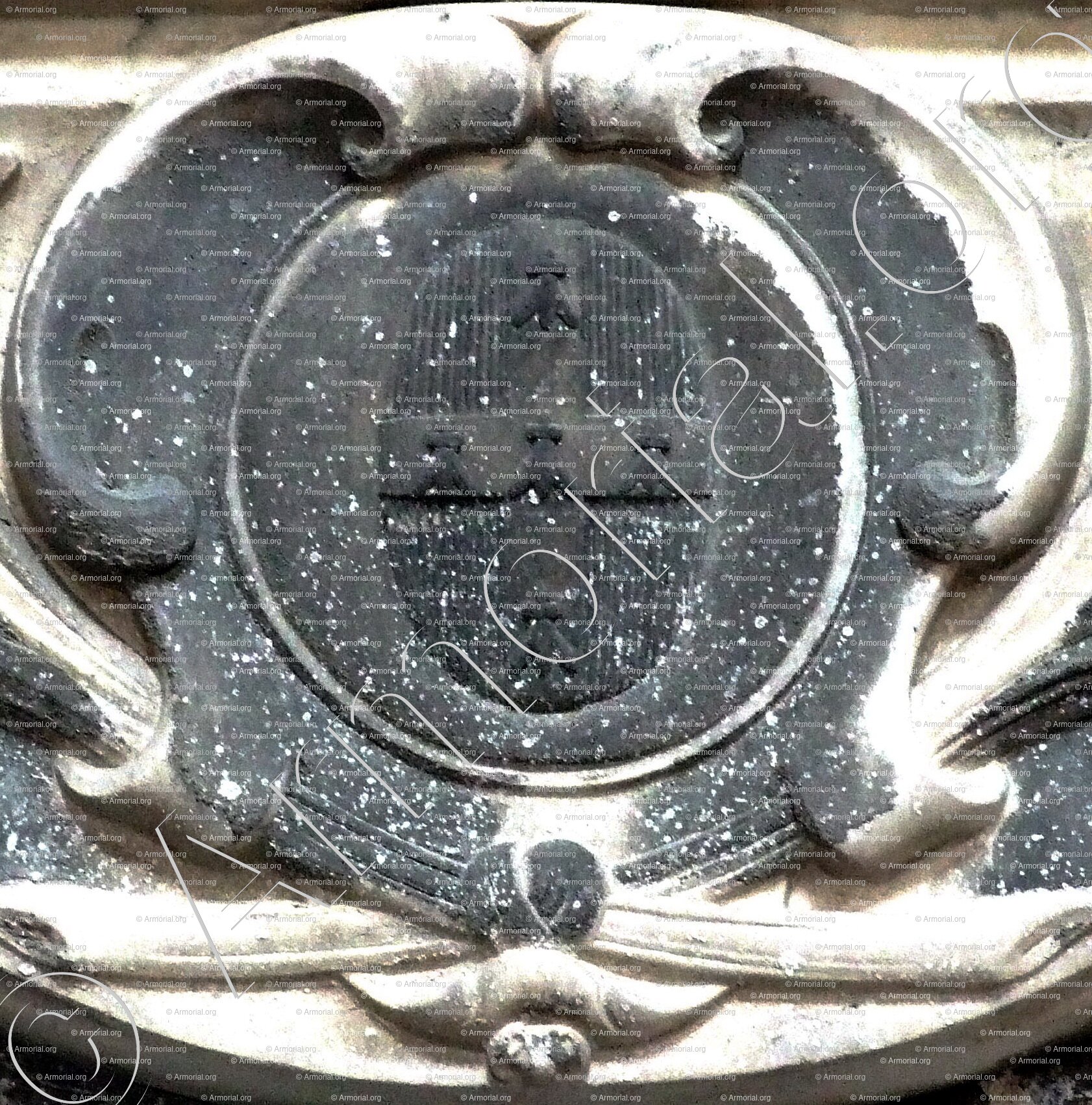 " De gueules, à la croix d'argent, ch. de cinq mouchetures d'hermine de sable ". Devise: MALO MORI QUAM FOEDARI.