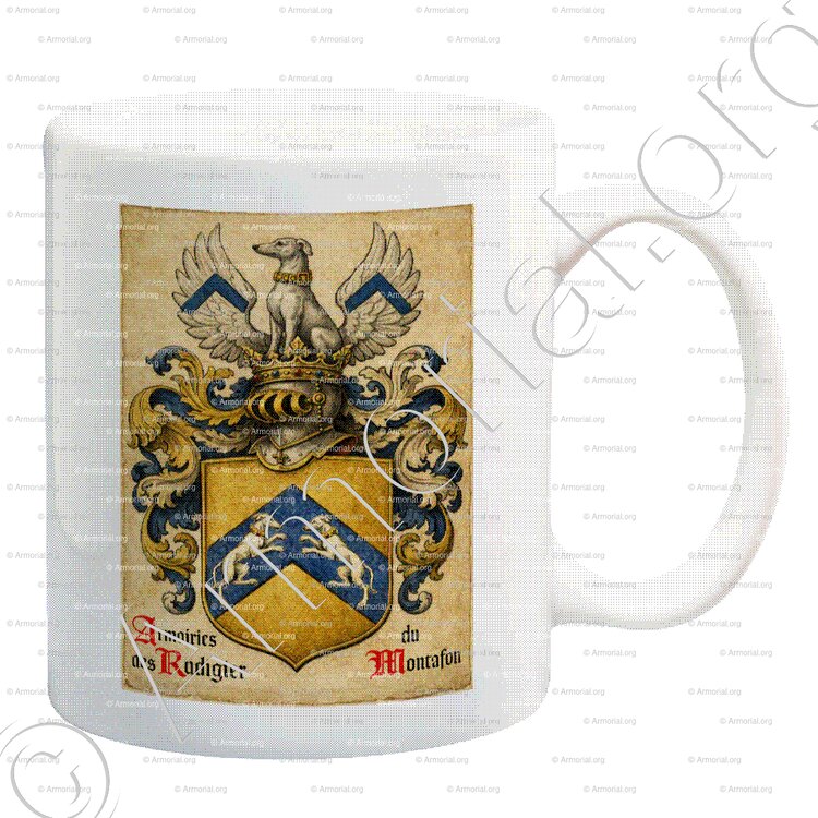 - Cimier: un lévrier d'argent, colleté et bouclé d'or, entre un vol d'argent, chaque aile chargé d'un chevron d'azur.