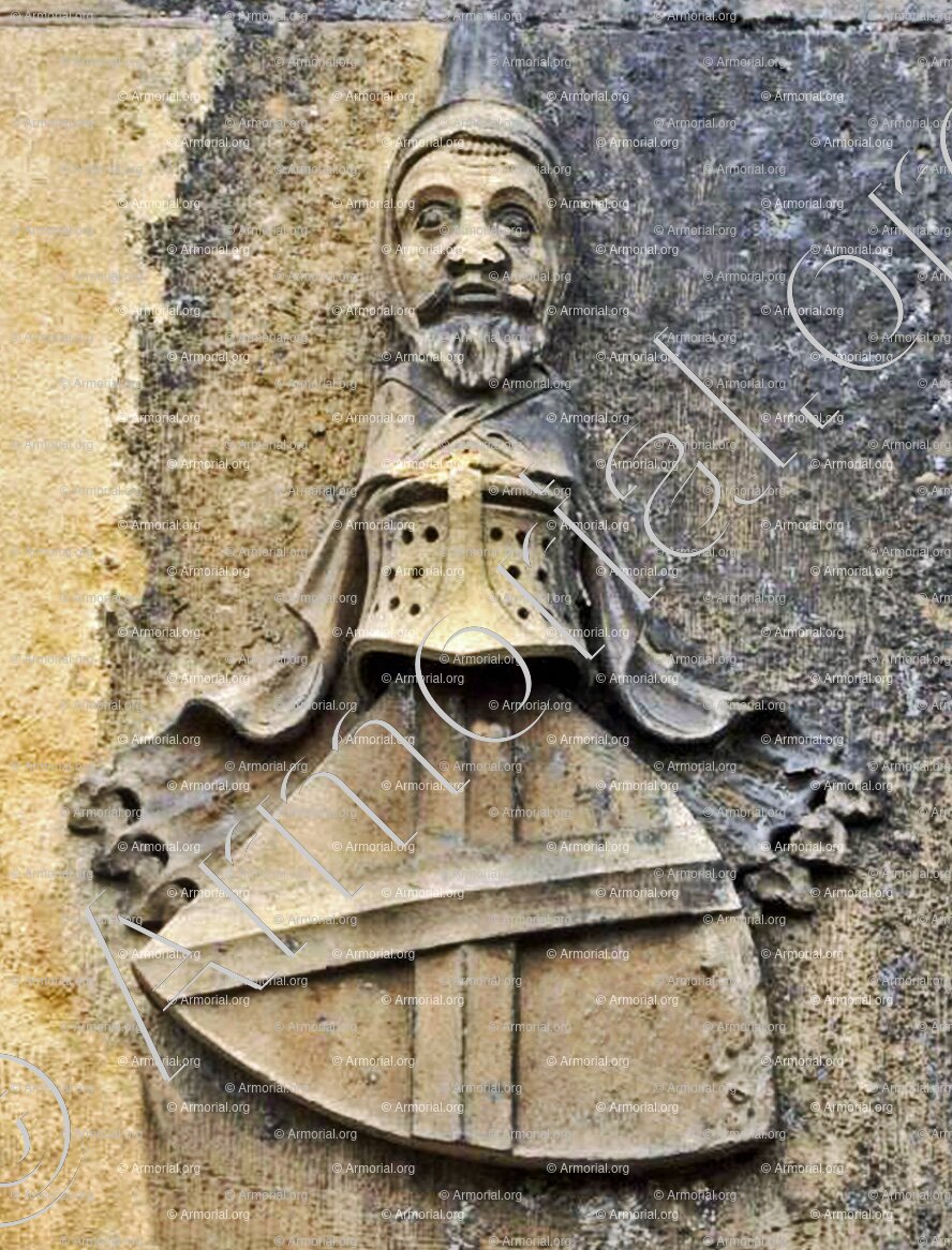 - Cimier: une tête d'homme, coiffé d'un chapeau en pointe.