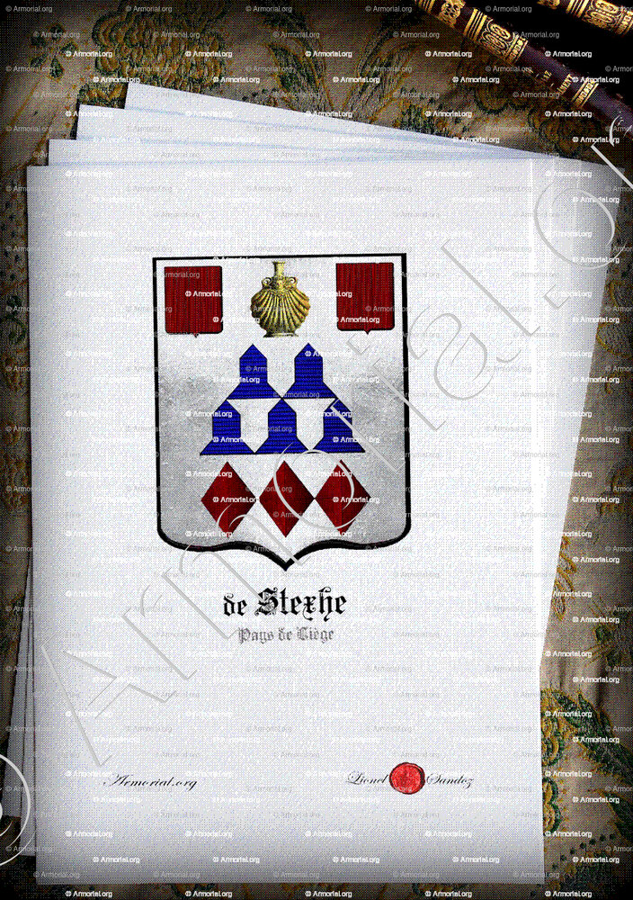 Le blason de STEXHE semble raconter une histoire d’honneur, de quête spirituelle et d’unité. La gourde d’or, centrale dans l’écu et le cimier, suggère une forte connexion à une tradition de pèlerinage ou à une mission sacrée, peut-être liée à une histoire locale ou familiale spécifique dans le Pays de Liège.