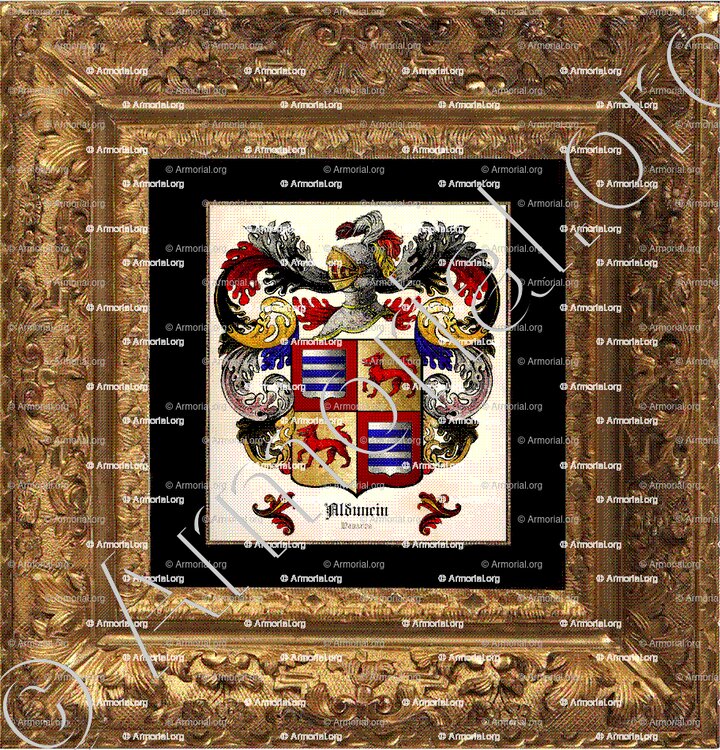 " Ecartelé: aux 1° et 4° , de gueules, à un écusson d'argent chargé de trois fasces d'azur ; aux 2° et 3°, d'or, un loup de gueules, passant. "