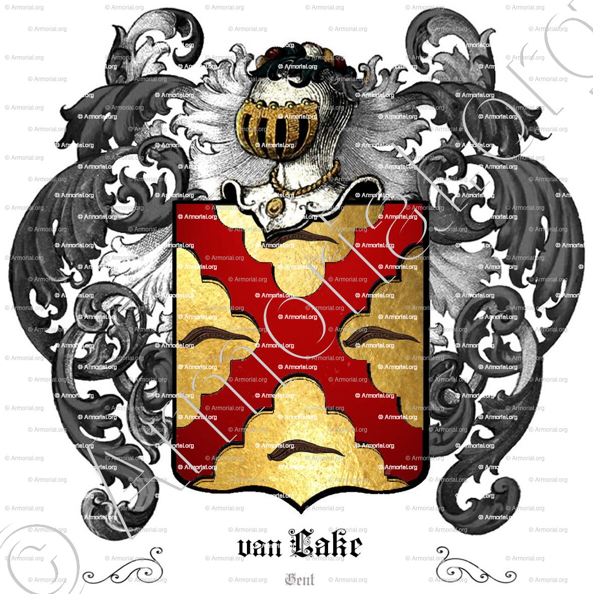 - Een edel man, genaamd Jean Van Lake, schildknaap, heer van Guwe, was amman van de stad Gent. Het draagt: " Goud een saltire keel, met vier bloedzuigers Sabel."