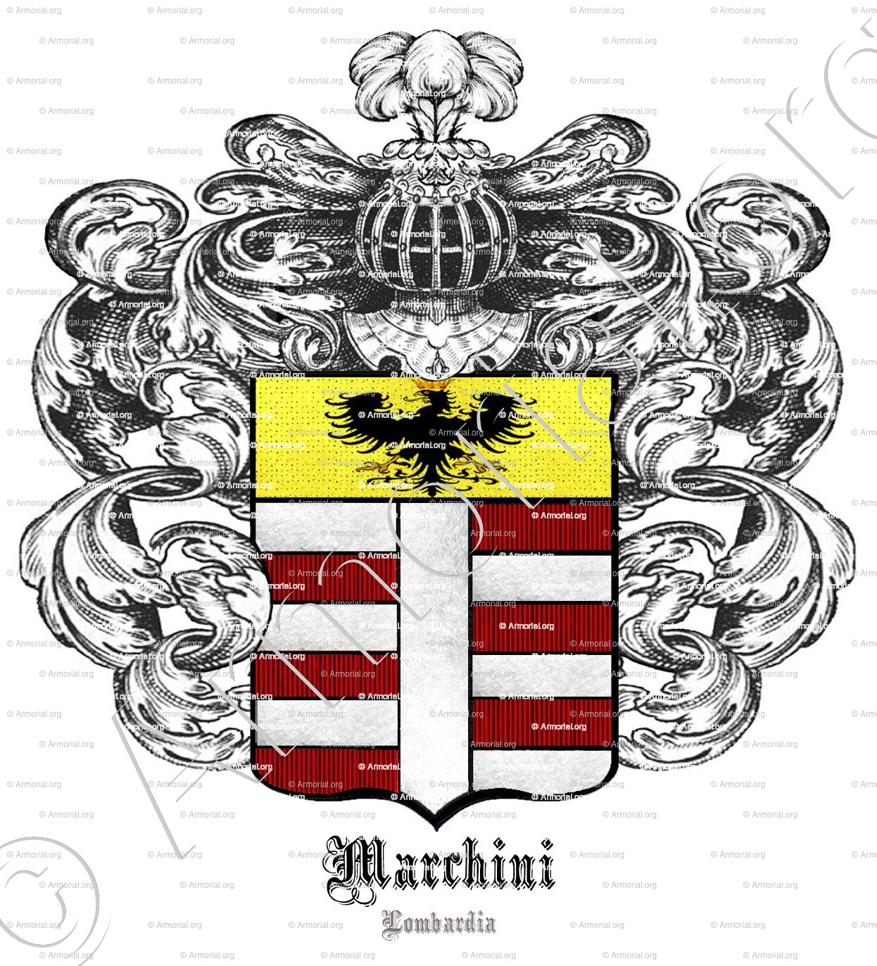 " Fasciato, controfasciato d'argento e di rosso di sei pezzi, al palo d'argento attraversante sul tutto; col capo d'oro, caricato di un'aquila di nero coronata del campo."