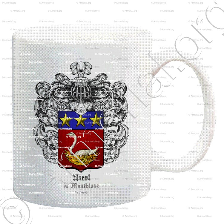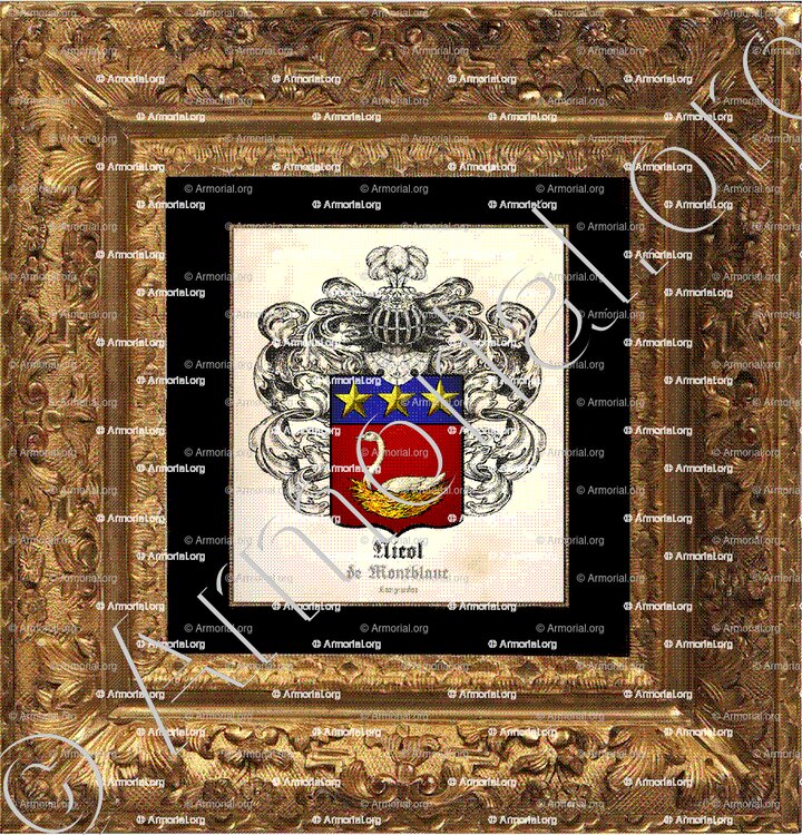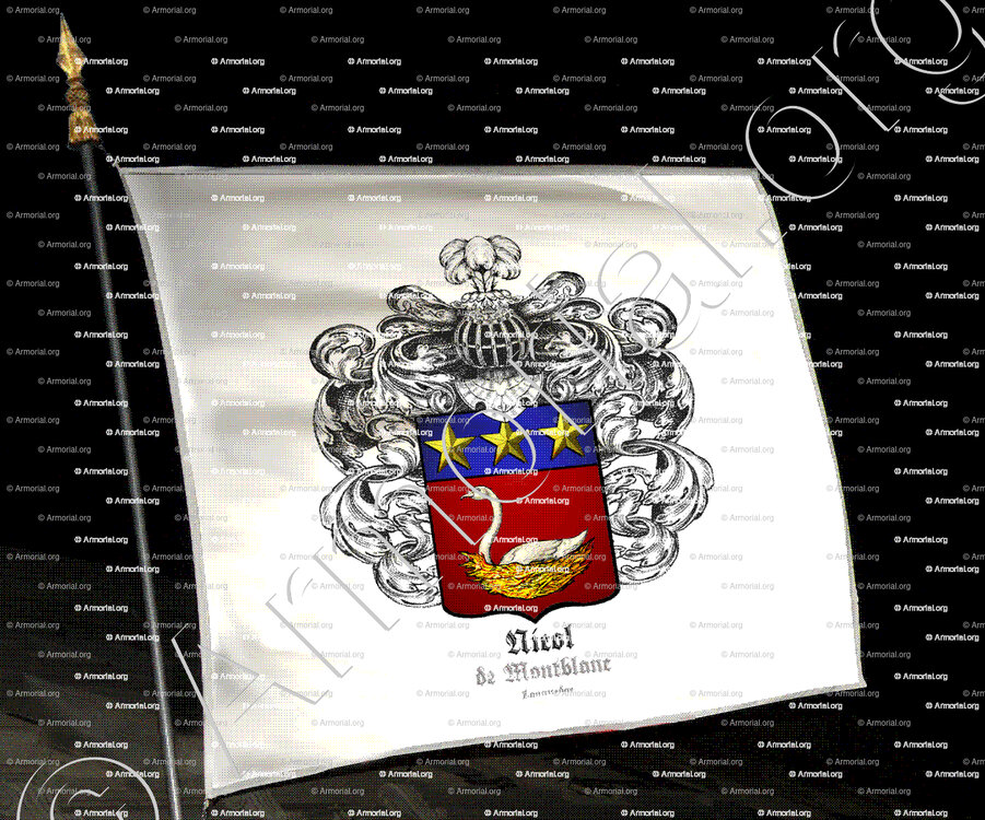 " De gueules, à un nid d'or bordé de sable, garni d'un cygne d'argent, le col hors du nid, au chef d'azur, chargé de trois étoiles d'or. "