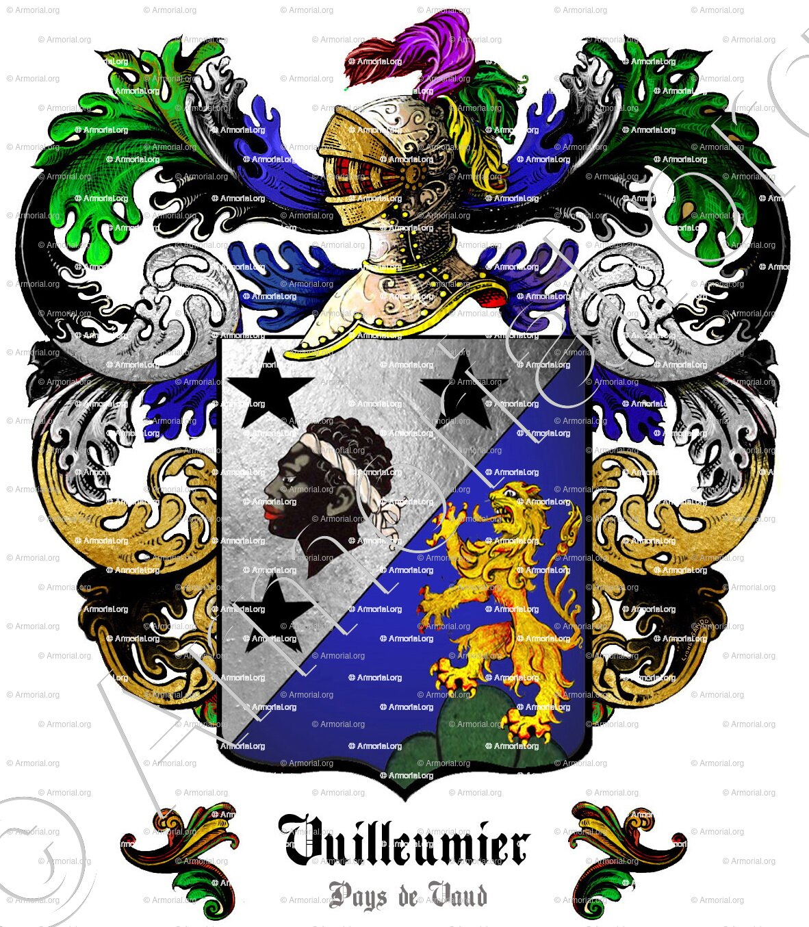 " Taillé: au 1, d'argent, à une tête de More, accompagné de trois étoiles (5) de sable, rangées en demi-orle; au 2, d'azur, au lion d'or, soutenu d'un tertre de trois coupeaux de sinople. "