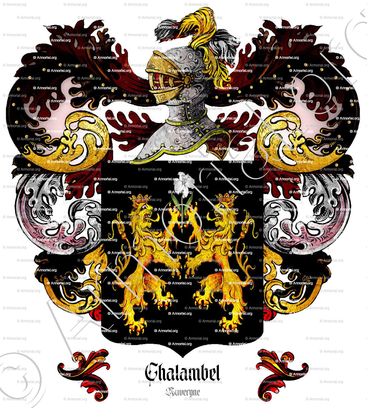 " De sable, à deux lions affrontés d'or, soutenant ensemble un lis de jardin au naturel. "