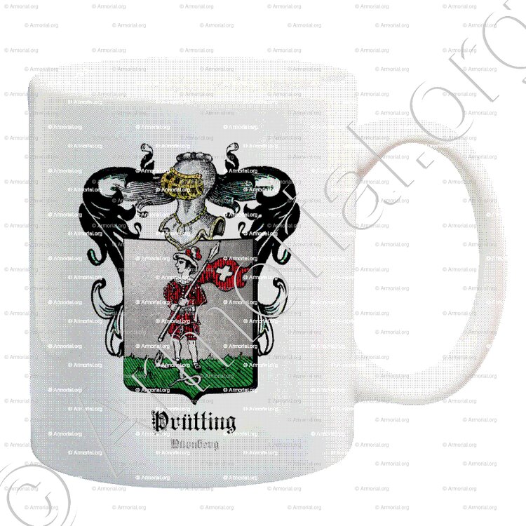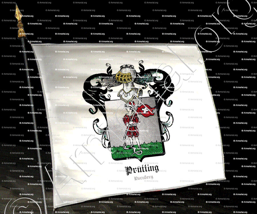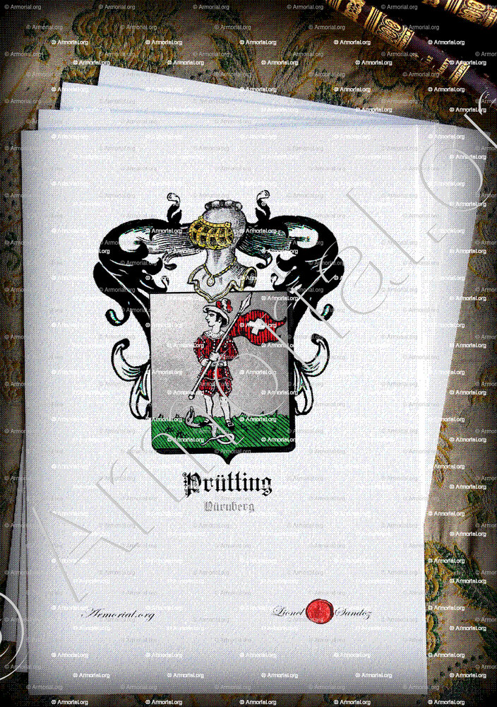 - Cimier: un homme d'armes, issant, tenant une hallebarde sur son épaule. Lambrequin: d'argent et de gueules.