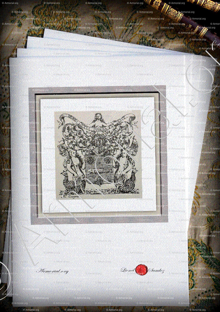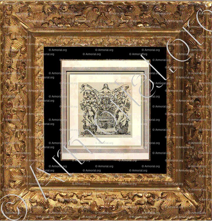 - Tenants: deux sirènes tenant chacune une lance avec guidon, celui à dextre d'or au lion de sable, celui à senestre parti d'azur, à la demi-aigle de gueules.
