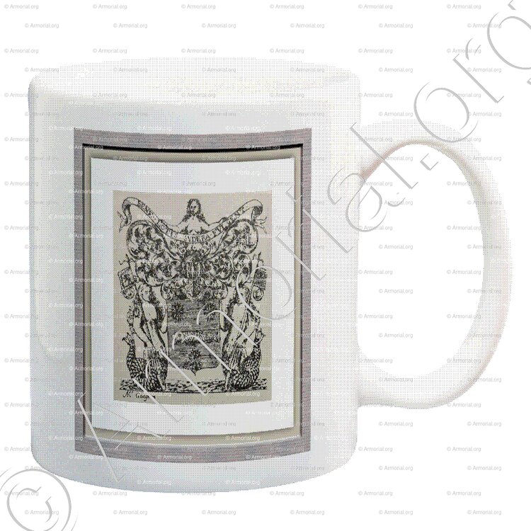 - Cimier: une femme nue issante de face, entre deux vols bannerets aux armes de l'écu.