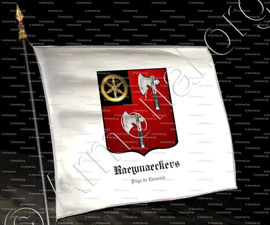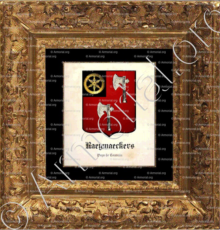 " De gueules, à trois haches d'argent, au franc-quartier de sable chargé d'une roue de six rayons d'or. "