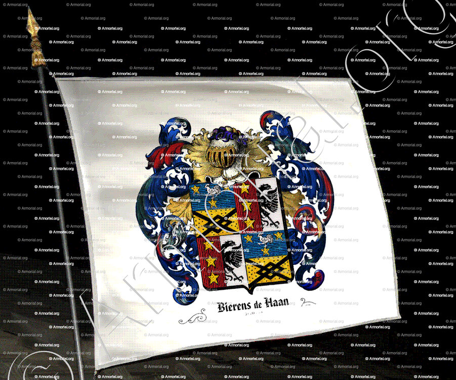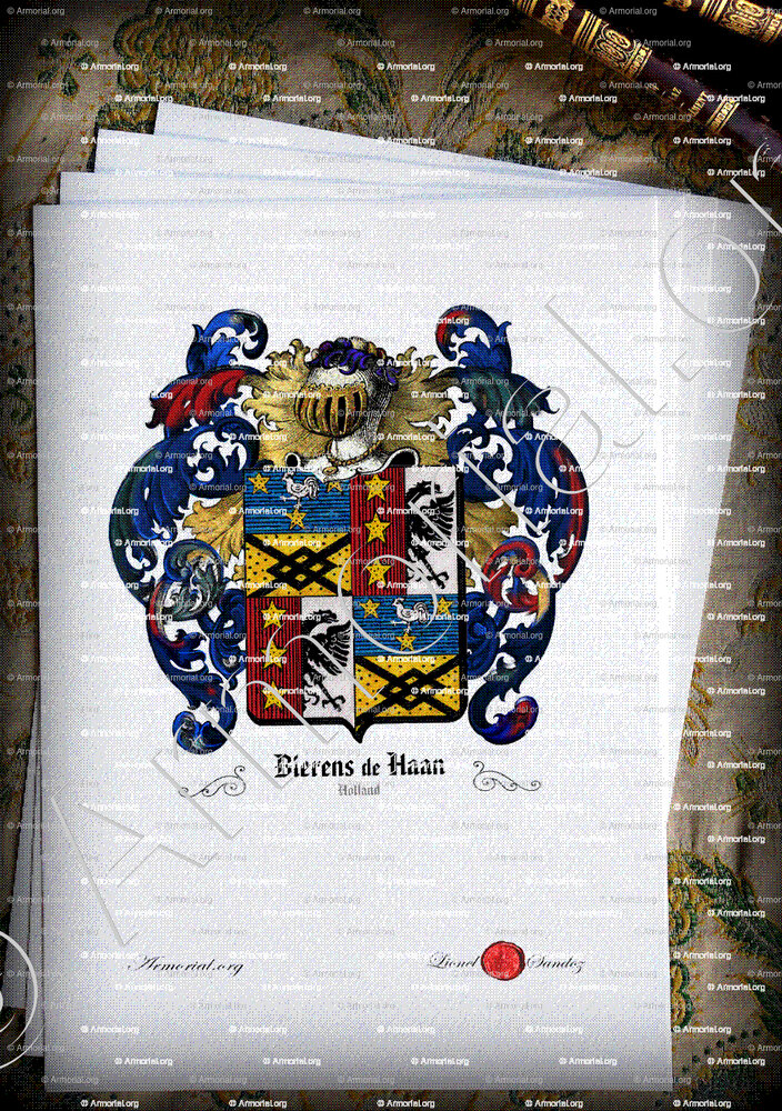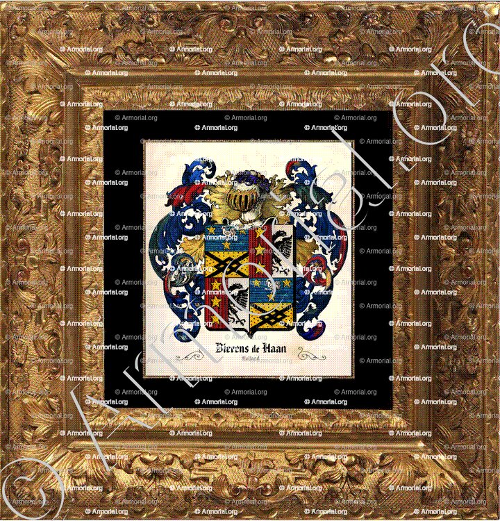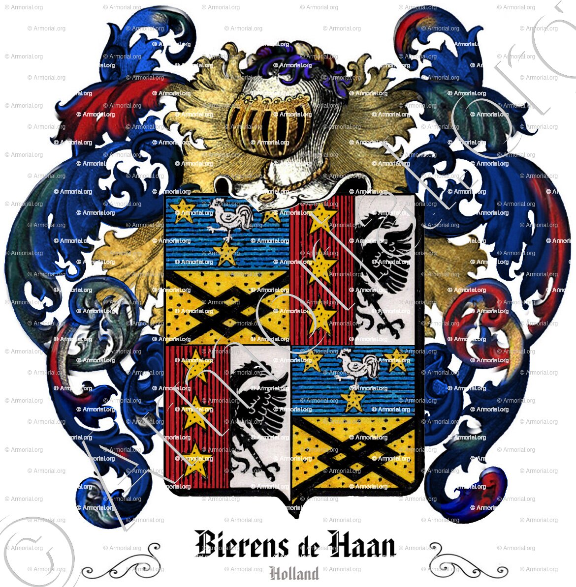 " Gevierendeeld: 1 en 4, snee: a. azuur met een haan, geflankeerd door twee sterren (5) en vergezeld van nog een ster (5) in de punt, alles in goud; b. in goud een zwarte dwarsbalk (van Haan); 2 en 3, gedeeld: a. keel (rode) drie sterren (6) in goud, geplaatst in de hoogterichting; b. zilver met halve zwarte adelaar, komend uit het gedeeld schild (Bierens). "