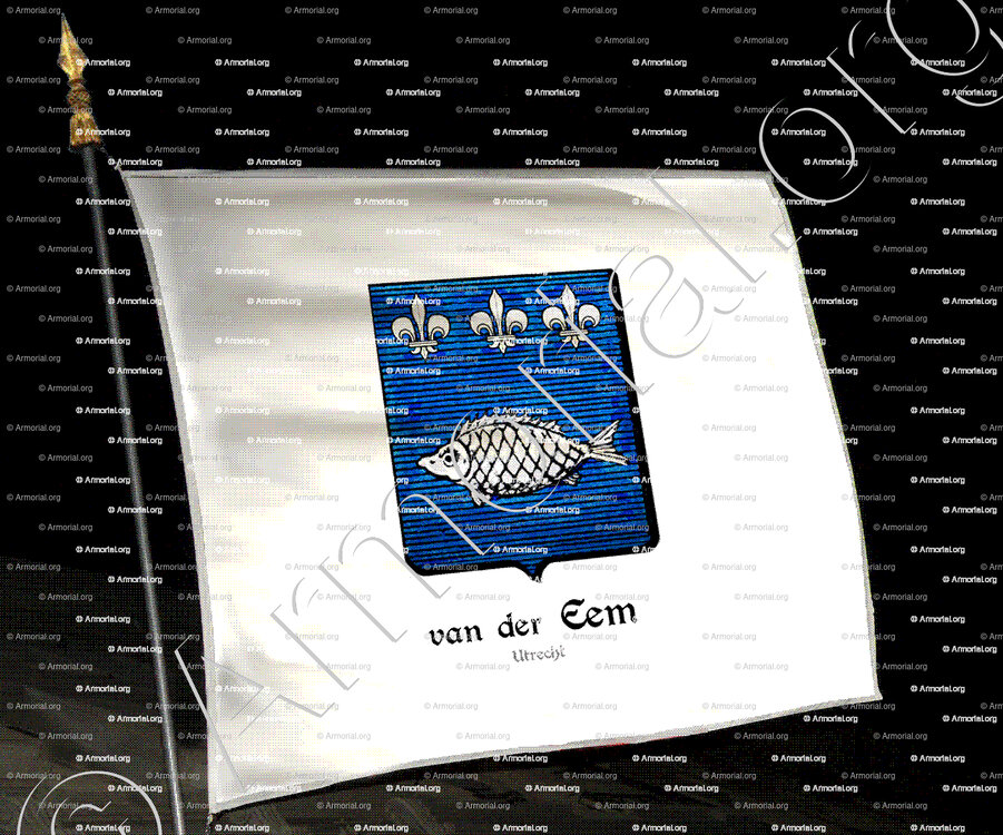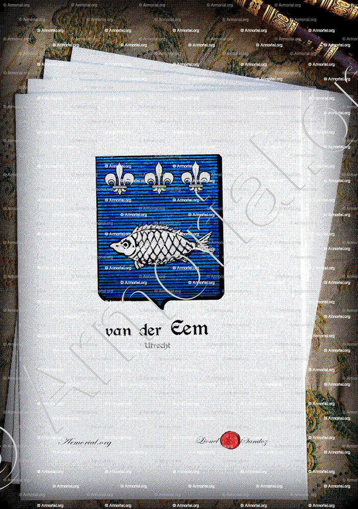 - Cimier: deux plies d'argent, posées en chevron renversé., les têtes en bas, issantes d'une cuve au naturel.