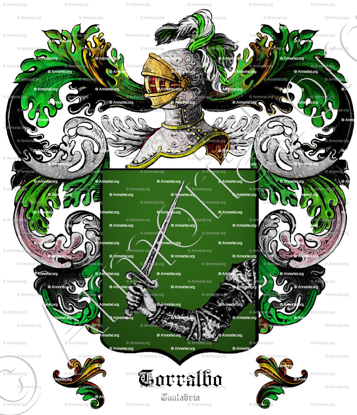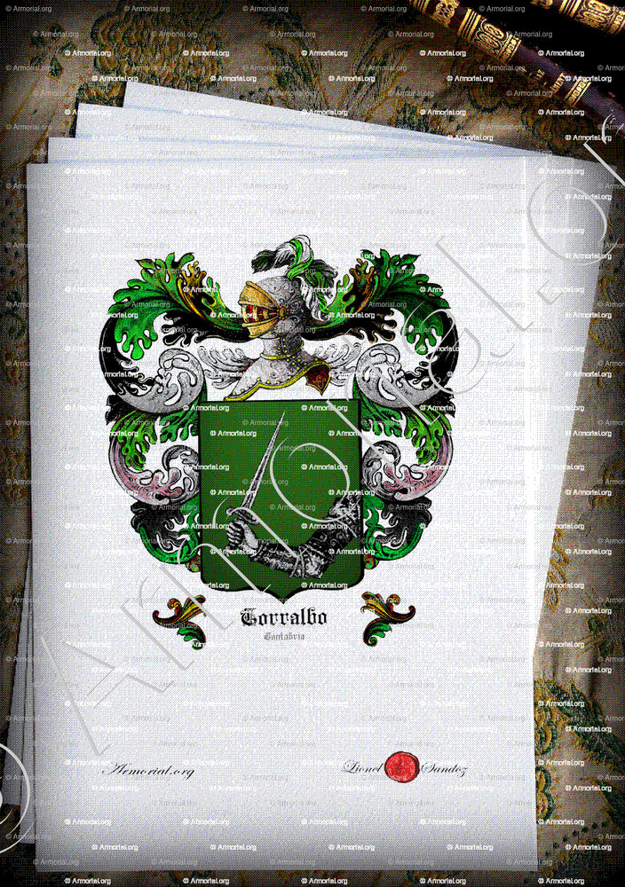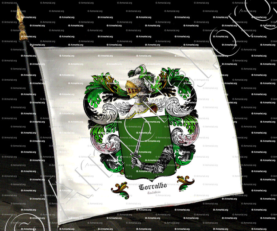 " En sinople, un brazo armado, de plata, sliendo del flanco siniestro y con una espada, de plata. "