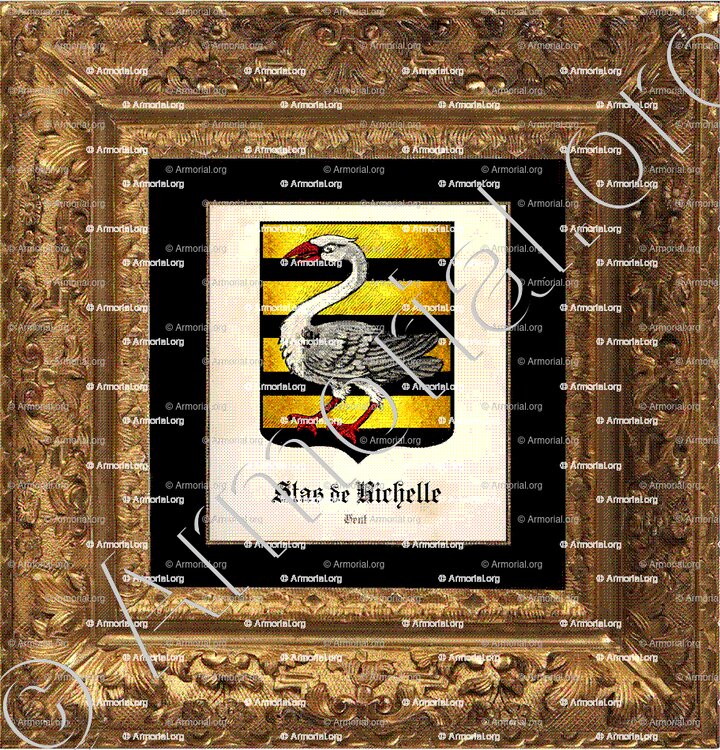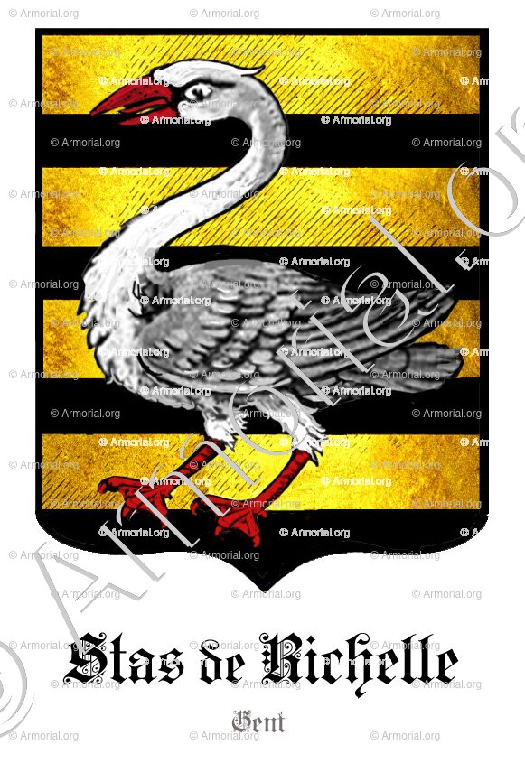 " Wapenschild verdeeld in acht, van goud en van sabel, met een zwaan van zilver, bek en poten van keel, over alles heen geplaatst. "