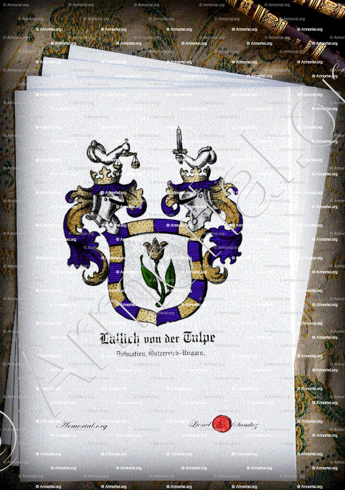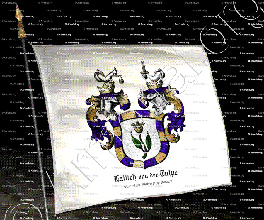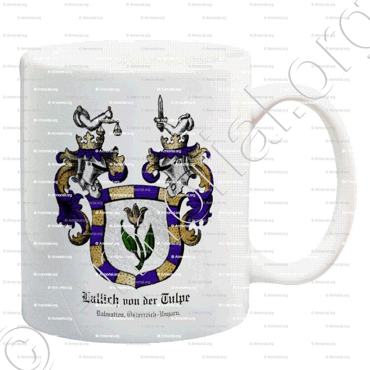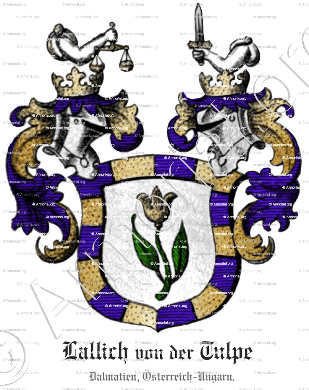 " D'argent, entouré d'une bordure composée de quatorze pièces alternativement d'azur et d'or, une tulipe naturelle (en référence au nom slave Lallich = Tulipe) sur une grande tige de sinople avec deux feuilles dressées vers le haut. "