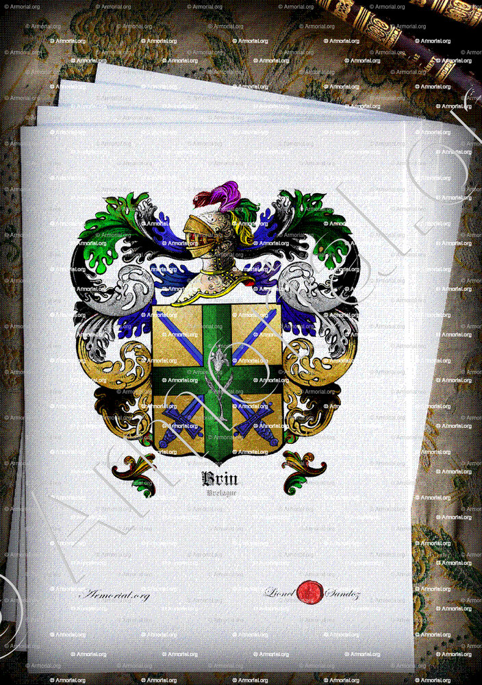 BRIN. — Name of a family originating from Tiffauges, where a squire of a watch of Clisson was encountered in Ploërmel in 1380 (Western Historical Review), frequently mentioned from 1370 to 1380 for the barony of Raiz, in the trials of Dom Morice. In the 19th century, a senior officer, ennobled in 1817, bore "or, two swords azure in saltire, a cross vert overall, charged with a silver lily stem, all on a terrasse of the same" (Nobility and Armorial of Brittany, by Pol Potier de Courcy, 1862. Armorial of Brittany by Guérin, 1845-1848, with colored coat of arms).