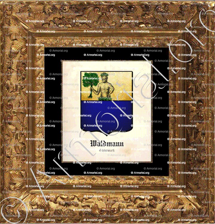 " Coupé d'or sur azur, l'or chargé d'un sauvage issant, couronné de lierre, mouvant du coupé et tenant de sa main dextre un arbre arraché de sinople. "