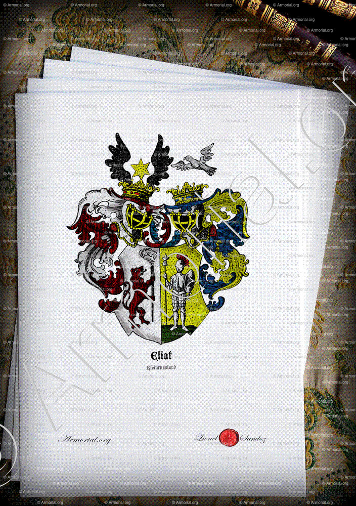 - Lambrequin: d'argent et de gueules; 2° une colombe volante au naturel.