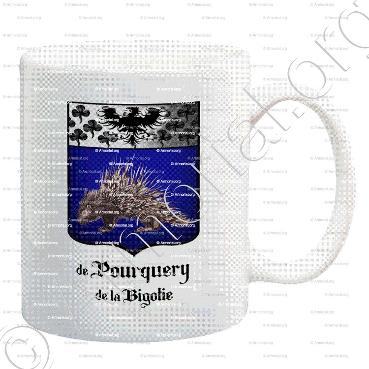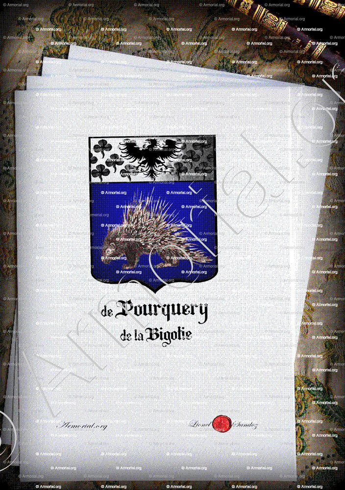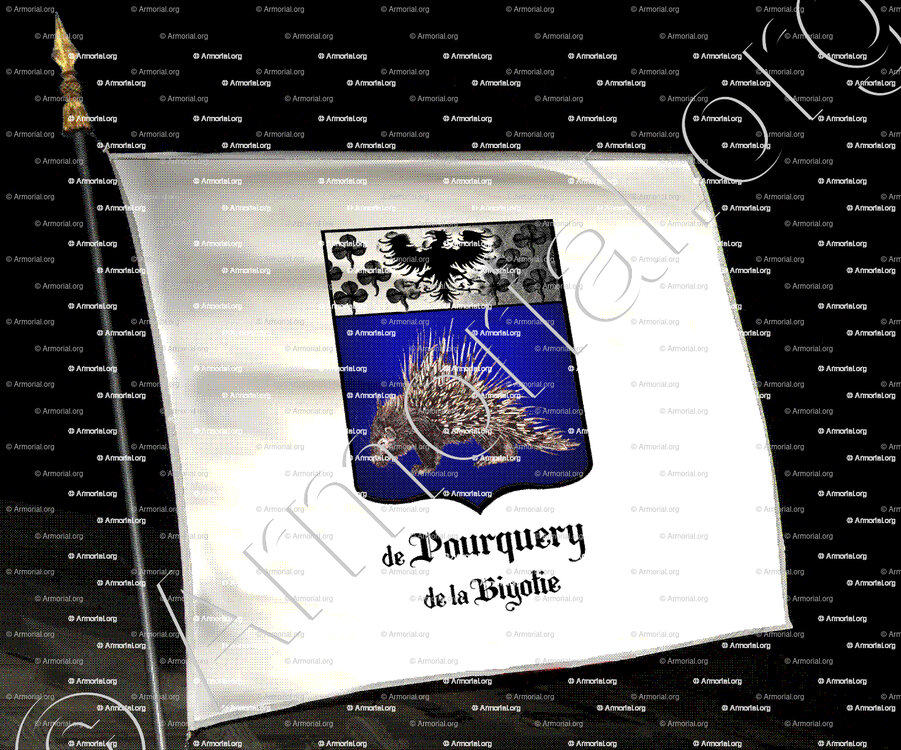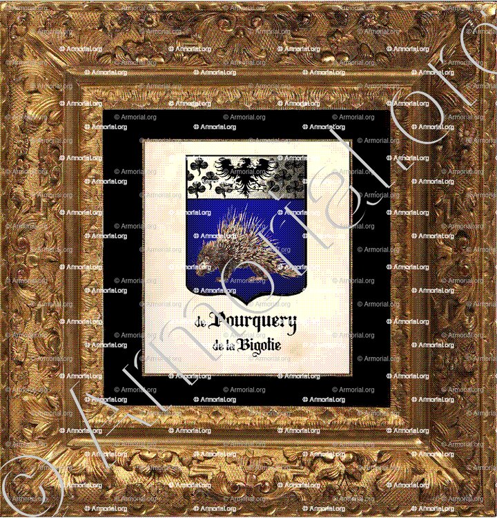 " D'azur au porc-épic d'argent défendu et armé du même ; au chef du second semé de trèfles de sable à l'aigle au vol éployé du même brochante " (relevées sur des sceaux antérieurs à 1789, dans lesquels elles se trouvent parties de celles de POURQUERY de LA ROCHE ancien qui est : " d'azur à la hure de sanglier d'argent, et accollées à celles de GRENIER DE MONTLONG) qui sont : " Tranché: au 1, d'argent, à une aigle de sable, le vol abaissé, au 2, de gueules, au lion d'argent, à une bande d'azur, chargée de trois étoiles d'or, au chef d'or, chargé d'une tête de More de sable. "