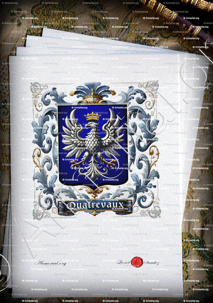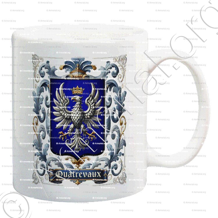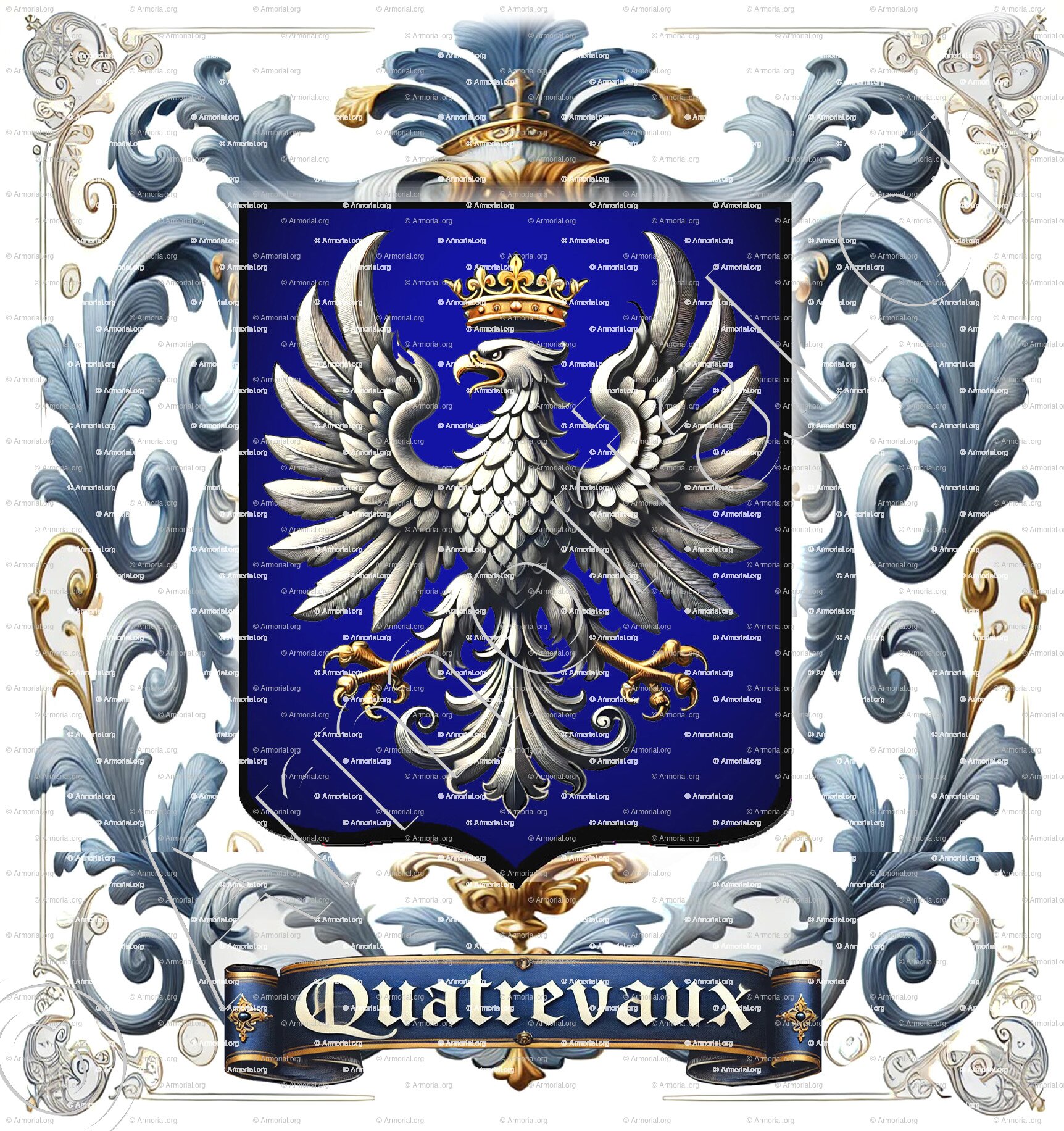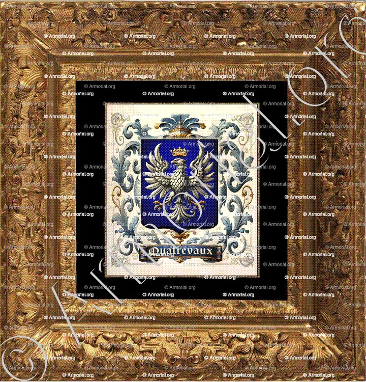Le blason associé à la famille QUATREVAUX, tel que décrit dans les documents, est : "D’azur à l’aigle éployée d’argent, couronnée d’or" (Arm. de l’Ars.).