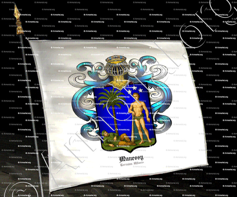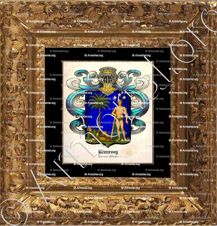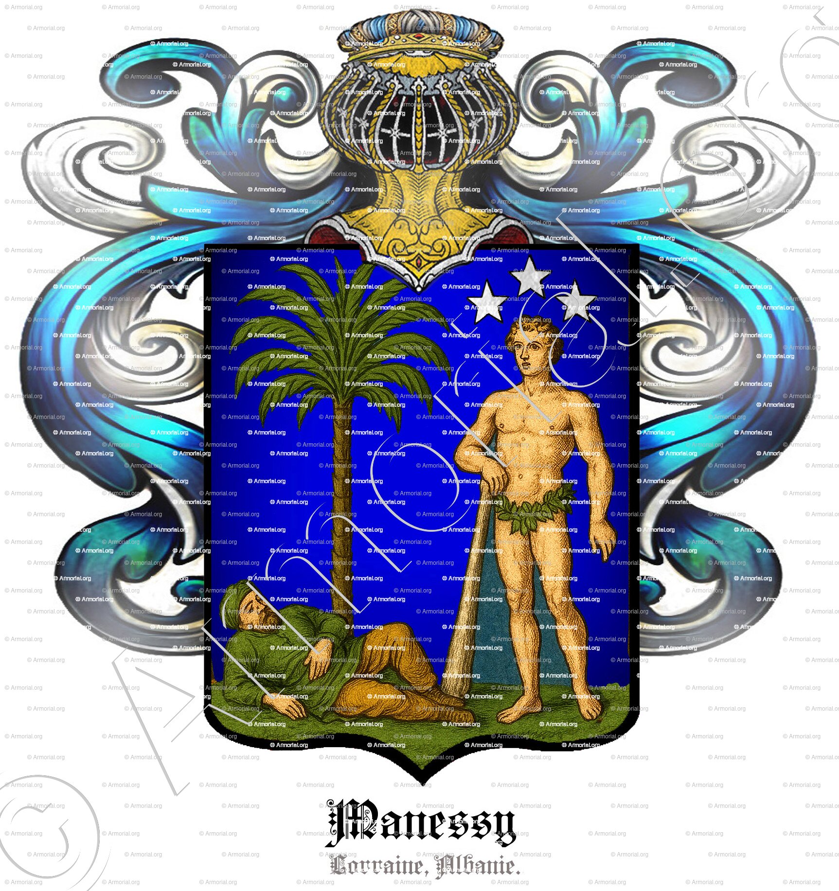 Les armoiries d’André MANESSY symbolisent son identité de capitaine albanais chrétien ayant combattu les Turcs (Turc abattu, palmier de victoire), sa force et son héroïsme (athlète avec massue), ainsi que la noblesse et les aspirations spirituelles de sa famille (étoiles d’argent sur fond d’azur). Elles célèbrent à la fois son passé de guerrier, sa résilience face aux épreuves, et la reconnaissance de sa noblesse par les autorités de l’époque.