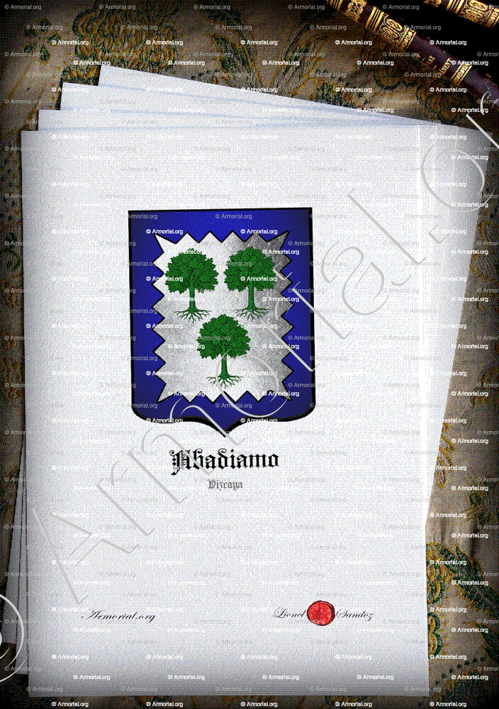 El nombre ABADIAMO se menciona en contextos relacionados con Vizcaya, provincia histórica del País Vasco español, así como en Francia, probablemente debido a frecuentes migraciones transfronterizas en esta región. Etimológicamente, el nombre podría derivar de raíces vascas o ibéricas. El prefijo «Aba-» es común en la onomástica vasca, a menudo relacionado con nociones de lugar o refugio (abar significa «rama» o «abrigo» en euskera). El sufijo «-diamo» podría ser una adaptación fonética, quizás influenciada por contactos con el castellano o el latín, lo que sugiere una evolución lingüística a lo largo de los siglos. Una hipótesis plausible es que este nombre esté vinculado a un topónimo o característica geográfica de Vizcaya, una región conocida por sus paisajes boscosos y montañosos, lo que también podría reflejarse en las armas familiares.