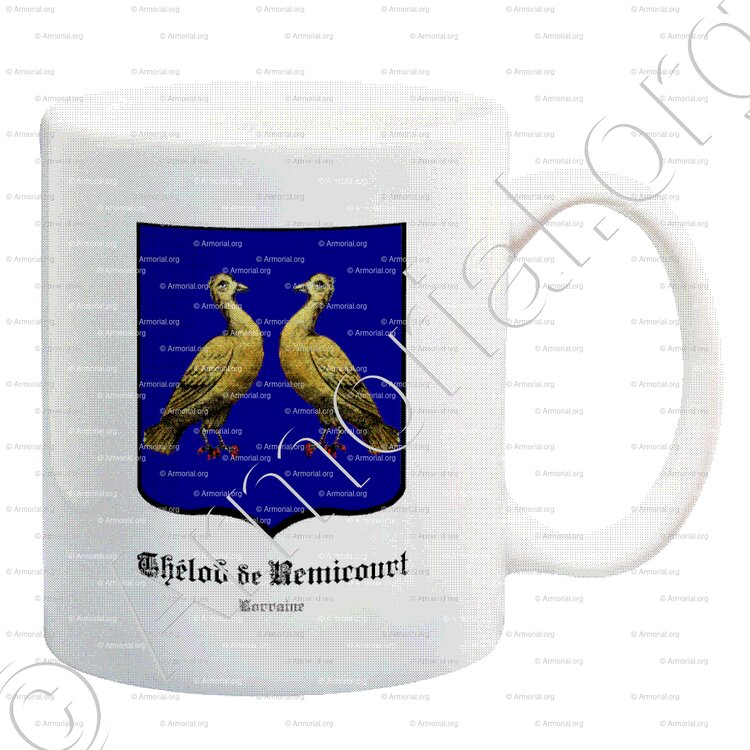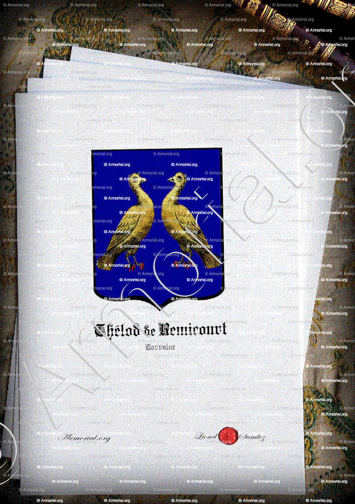 Les armoiries de la famille THÉLOD de REMICOURT sont décrites comme suit : D'azur à deux colombes affrontées d'or, les pattes d'argent, armées de gueules.