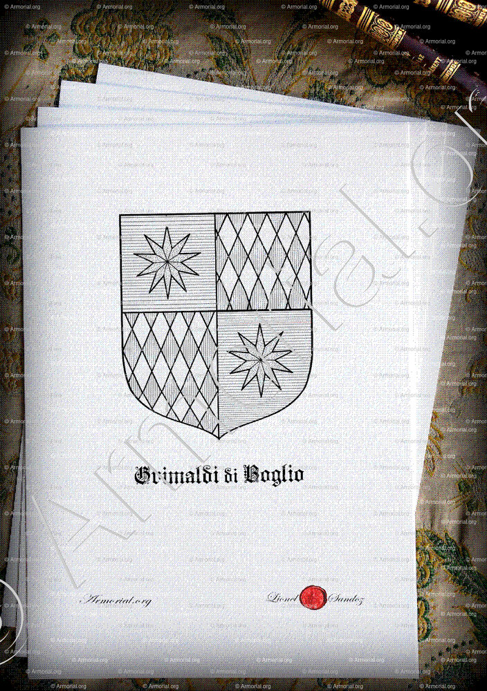 - Cette composition héraldique fusionne les armes traditionnelles des GRIMALDI (fuselé d'argent et de gueules, symbolisant l'héritage génois et la loyauté guelfe) avec celles de BOGLIO (d'azur à l'étoile d'or, évoquant la guidance céleste et la noblesse provençale).