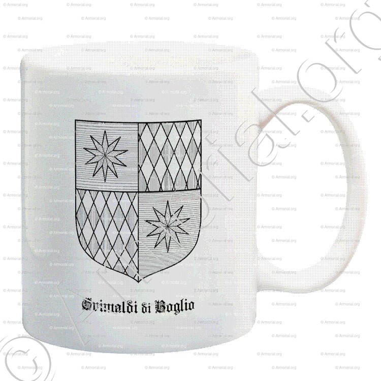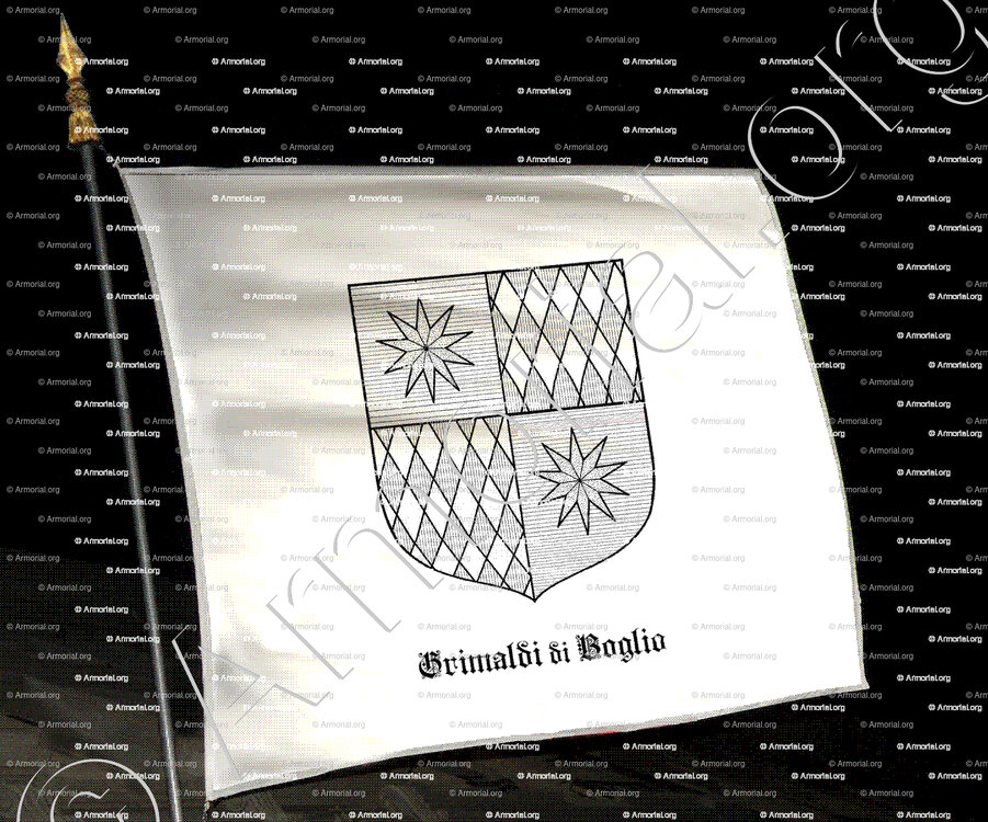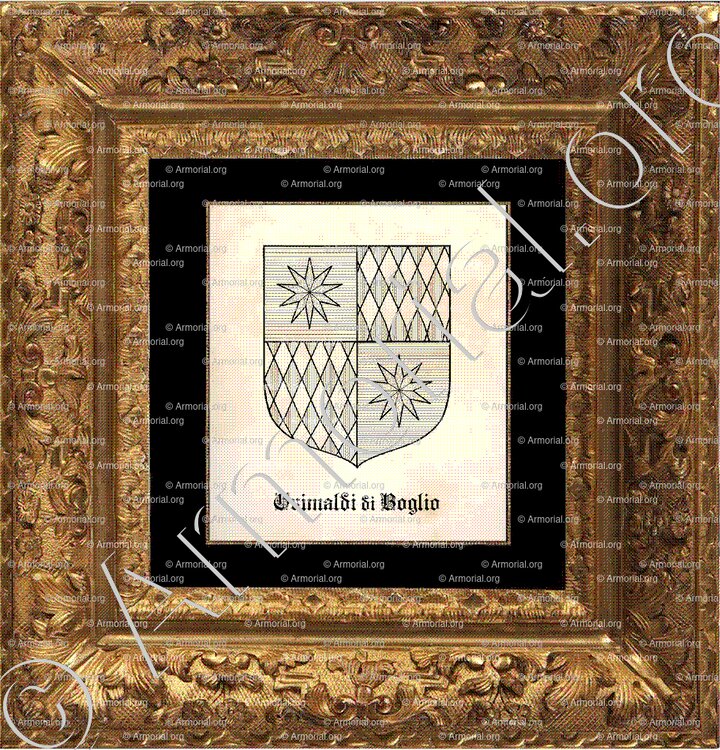 Questa composizione araldica fonde le armi tradizionali dei GRIMALDI (fusato d’argento e di rosso, simbolo dell’eredità genovese e della fedeltà guelfa) con quelle di BOGLIO (d’azzurro con una stella d’oro, che evoca la guida celeste e la nobiltà provenzale).