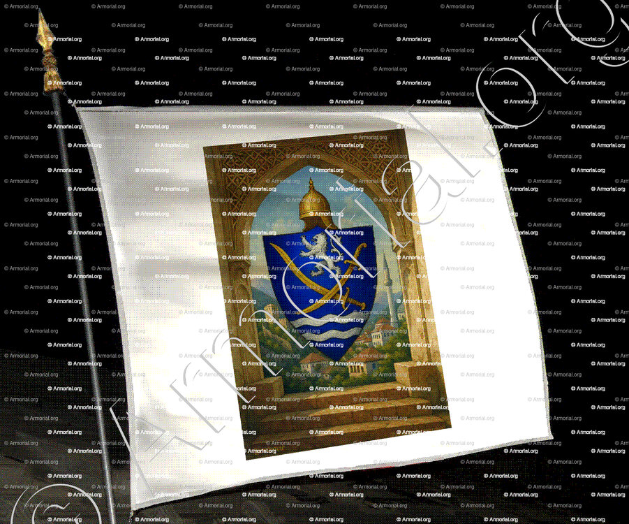 « D’azur, à un yatagan (ou cimeterre) d’or, posé en pal ; accompagné en chef d’un lion rampant d’argent, et en pointe de trois fasces ondées d’argent. »