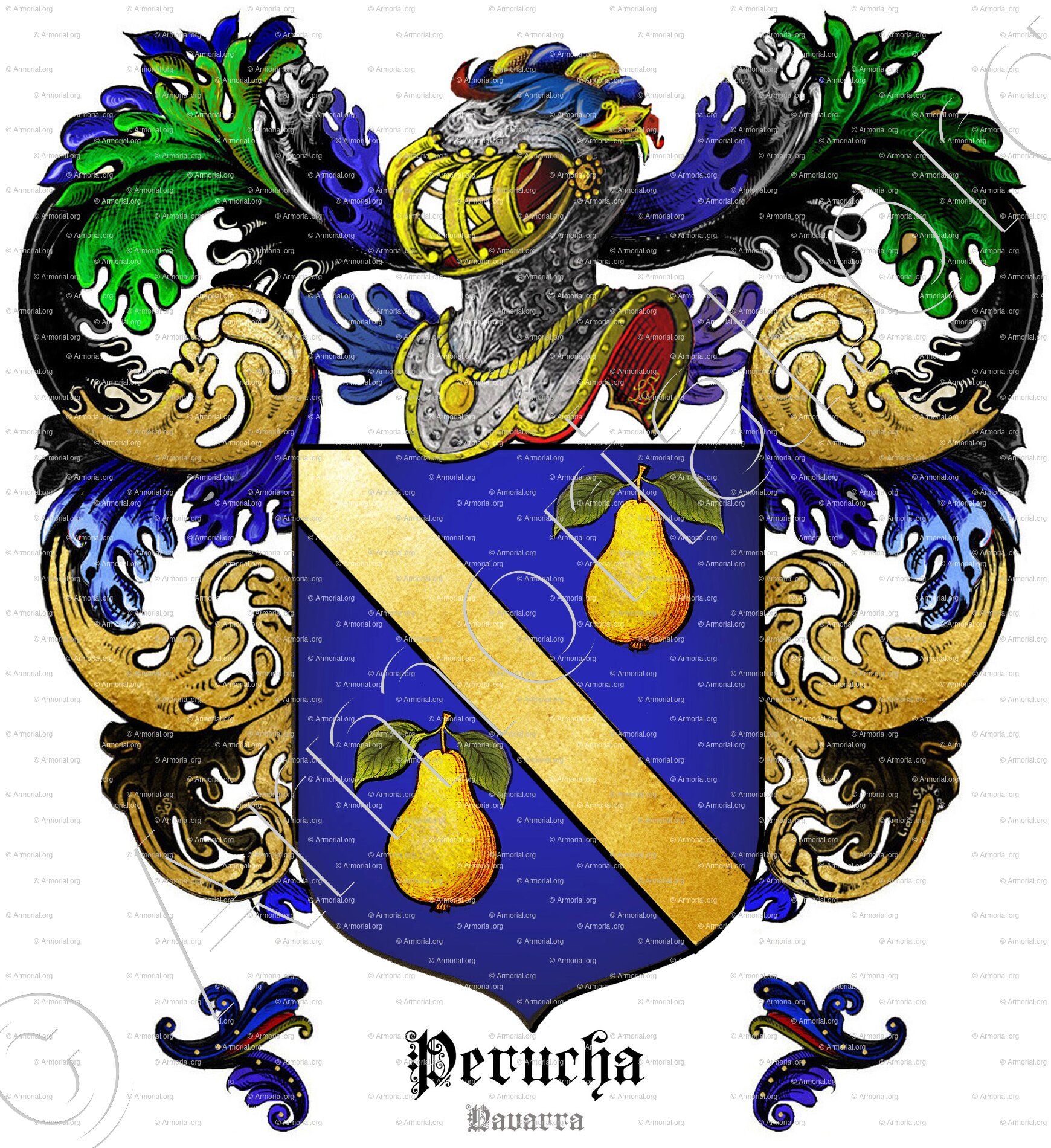 1.º y 4.º, de azur, con banda de oro acompañada de dos peras de oro hojadas de sinople (Perucha antiguo);