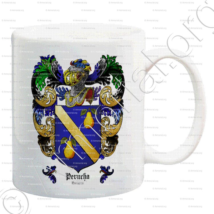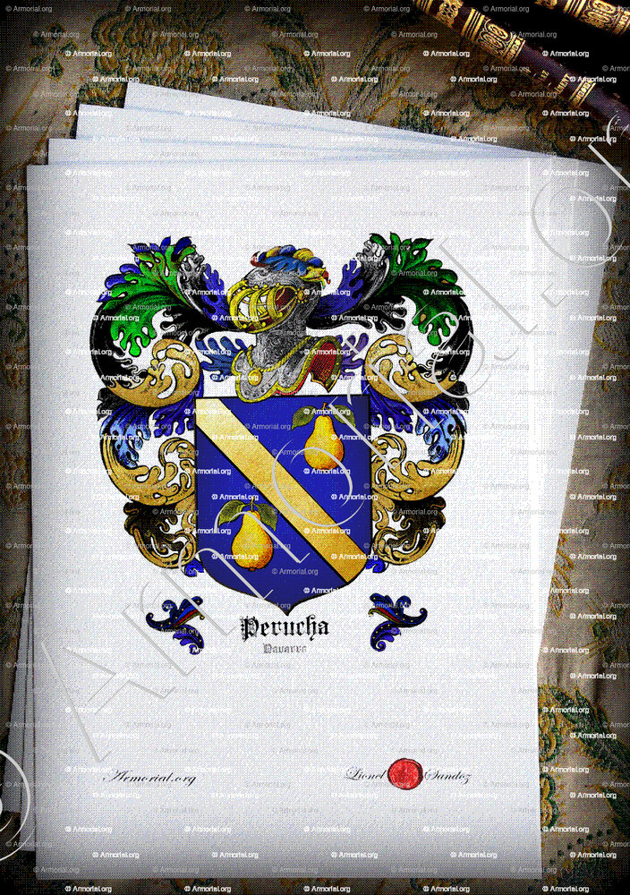 aux 1 et 4, d’azur à la bande d’or accompagnée de deux poires d’or feuillées de sinople (Perucha ancien) ;