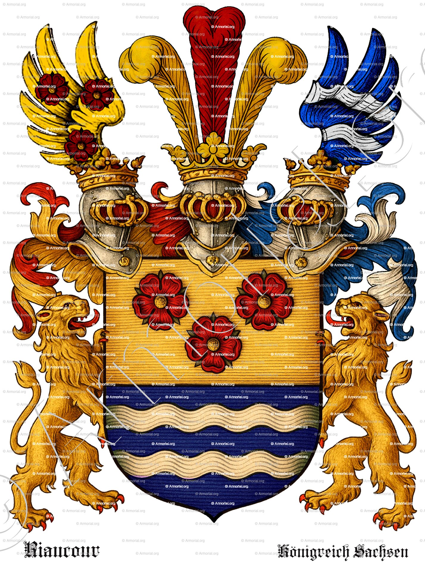 - Cimiers: 1° un demi-vol contourné, aux armes du 1; 2° trois plumes d'autruche, une de gueules, entre deux d'or; 3° un demi-vol aux armes du 2.