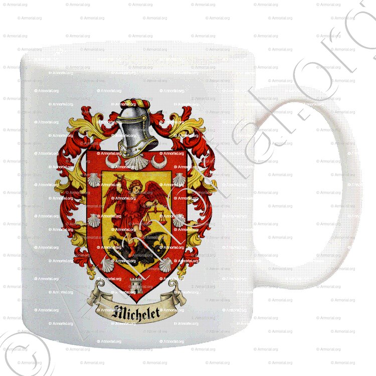 " D'or, à un Saint-Michel de gueules terrassant un dragon de sable, et tenant de la main senestre une balance aussi de gueules, à la bordure de gueules chargée en chef d'une de coquille, d'argent, accostée de deux croissants de même, et d'une tour aussi d'argent, et sur les flancs de six coquilles de même. " (Michelet de Vatimont, Lorraine.)