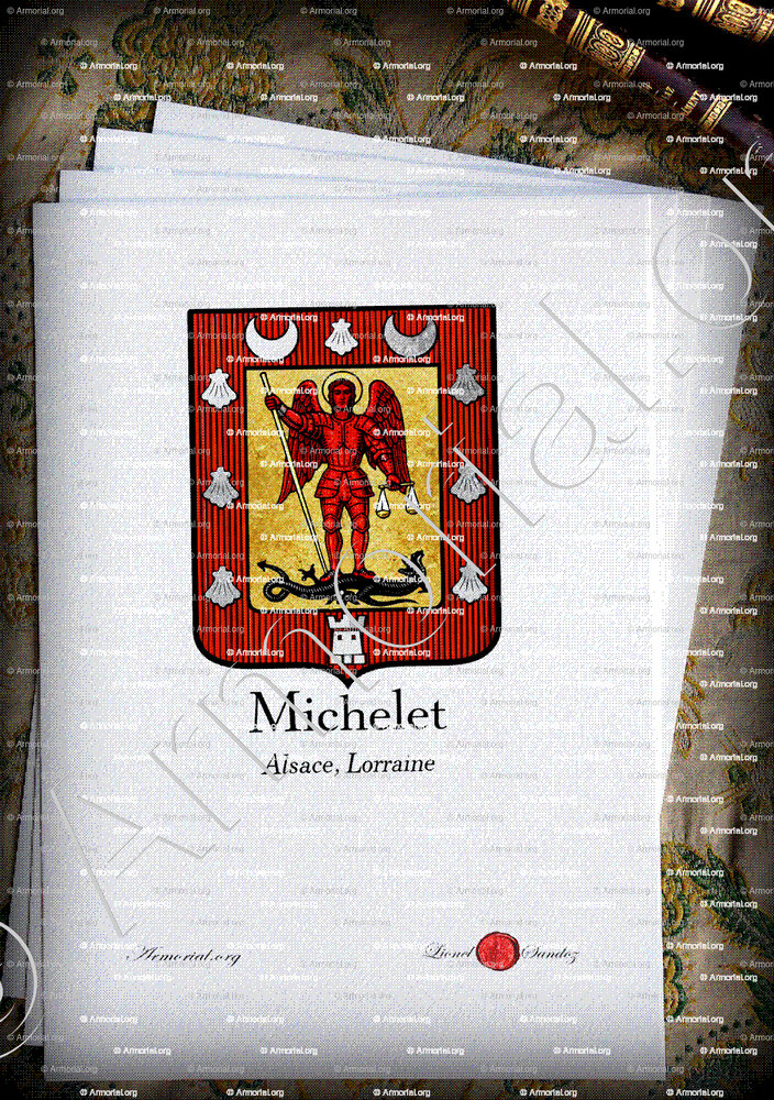 Cette composition riche et parlante (le Saint-Michel renvoyant sans doute au patronage du saint archange, protecteur des armées et des juges) est attestée dans des sources anciennes du XVIIIᵉ siècle, notamment dans des documents manuscrits relatifs à Abraham MICHELET, conseiller et lieutenant particulier au bailliage de Metz (vers 1770-1772).