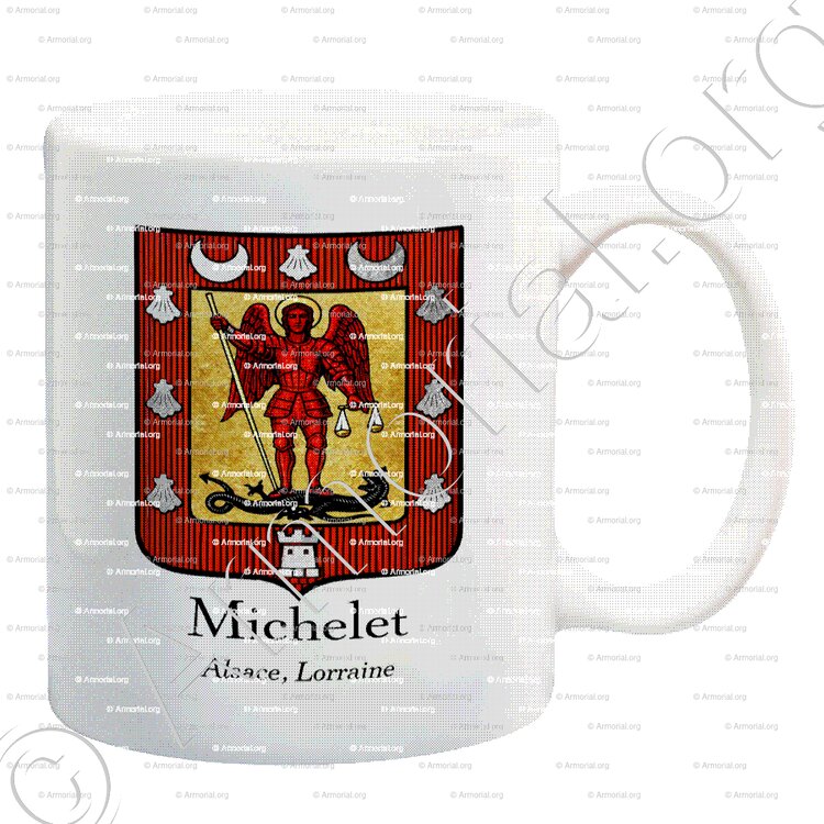 " D'or, à un Saint-Michel de gueules terrassant un dragon de sable, et tenant de la main senestre une balance aussi de gueules, à la bordure de gueules chargée en chef d'une de coquille, d'argent, accostée de deux croissants de même, et d'une tour aussi d'argent, et sur les flancs de six coquilles de même. " (Michelet de Vatimont, Lorraine.)