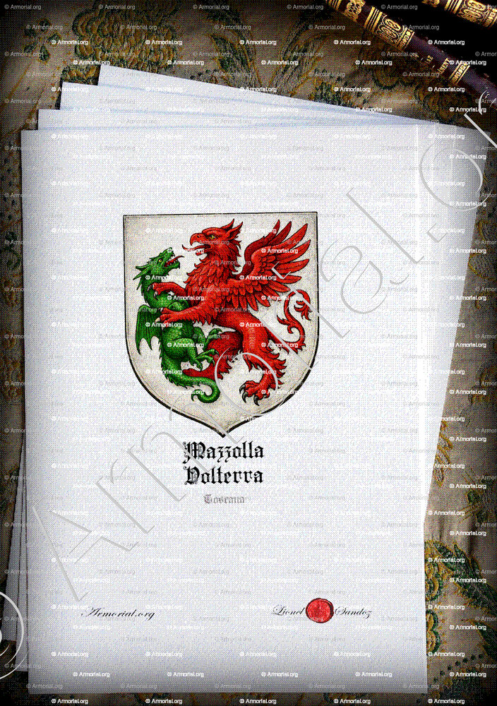 En tant que frazione dépendante de la commune de VOLTERRA, MAZZOLLA ne possède pas d'armoiries propres distinctes. Elle partage donc le blason historique de VOLTERRA, qui symbolise l'identité civique de la région.