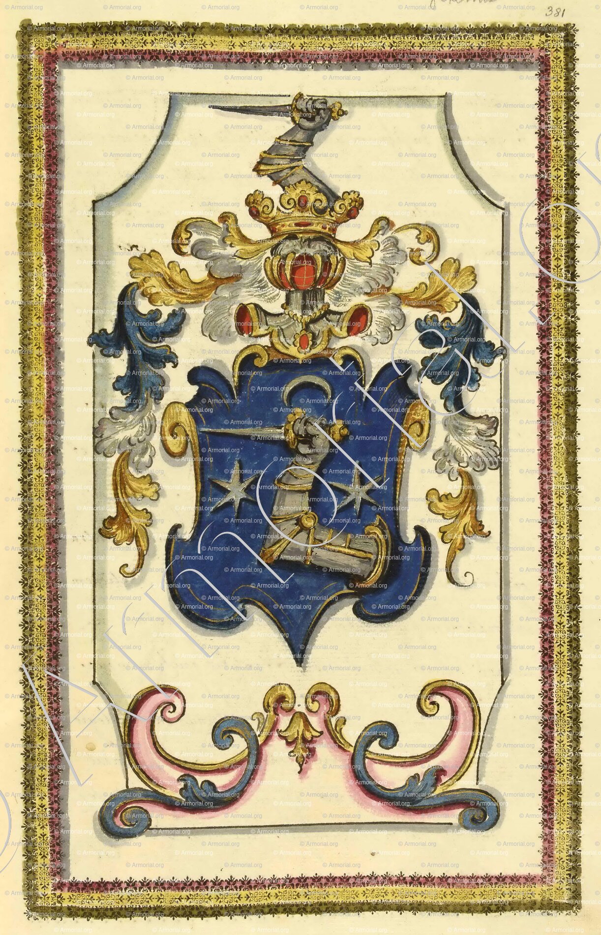 L’azur du champ évoque la loyauté, la vérité et la constance. Le dextrochère armé, issu du flanc senestre et brandissant une épée, symbolise la force militaire, le courage au combat et la défense du droit ou de la justice. Les deux étoiles accompagnant le bras représentent la noblesse d’esprit, la guidance céleste ou l’aspiration vers les vertus supérieures, éléments fréquents dans l’héraldique italienne pour signifier l’élévation morale ou la protection divine.
