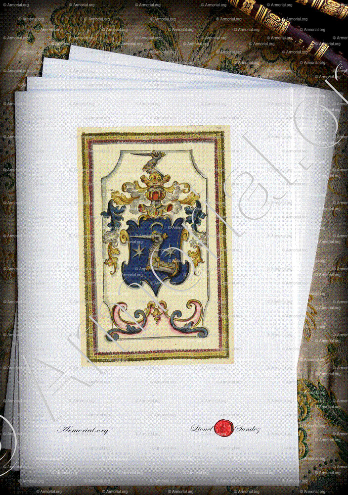 « D’azur, au dextrochère armé mouvant du flanc senestre, tenant une épée, accompagné de deux étoiles. »