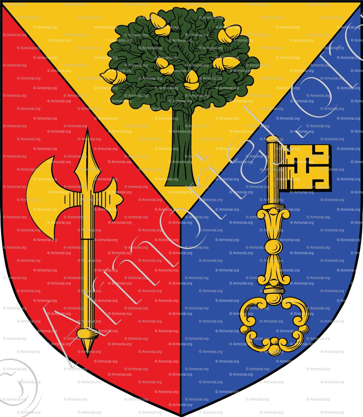" Tiercé en pairle renversé : en chef d’or au chêne de sinople englanté d’or, à dextre de gueules à la hallebarde d’or posée en pal, à senestre d’azur à la clef d’or posée en pal. "
